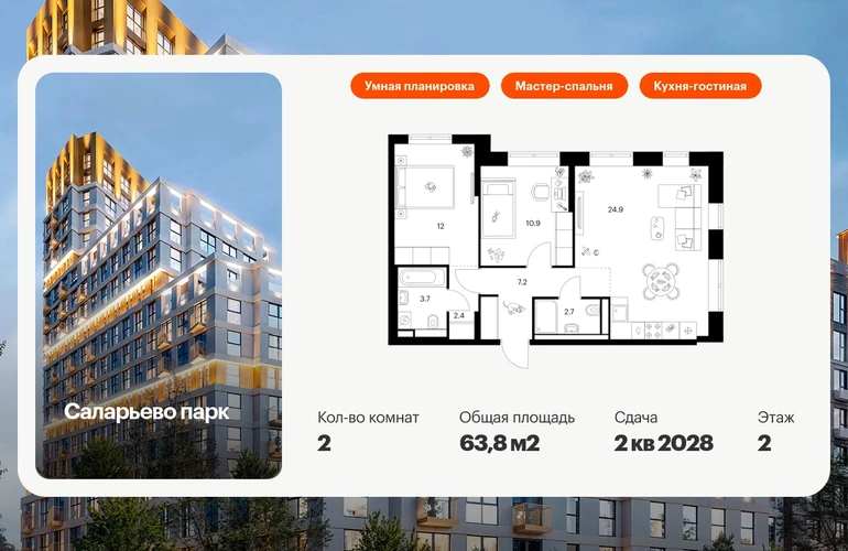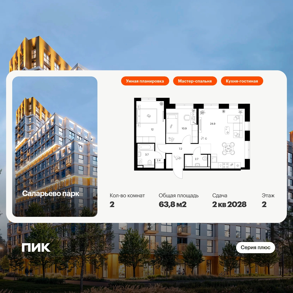 Продаётся 2-комн.квартира площадью 63.80 кв.м на 2 этаже 14 этажного дома (Корпус 57.5, секция 5) проекта ПИК Саларьево парк. Светлый просторный подъезд на уровне земли, функциональная планировка, большие окна, с отделкой. Жилой район «Саларьево парк» расположен в Новой Москве, в четырёх километрах от МКАД по Киевскому шоссе. Две станции метро: «Саларьево» и «Филатов луг», — находятся в пешей доступности от проекта. Дойти до них можно за 5–10 минут. В квартале уже создана качественная среда, где есть абсолютно всё для полноценной жизни, работы и отдыха. «Саларьево парк» — не просто квартал, а полноценный жилой район, который отличается разноплановой архитектурой. Над концепцией квартала работали несколько ведущих архитектурных бюро, которые стремились добиться разнообразия в фасадных решениях. Ярким примером такого подхода станут корпуса 82 и 83, которые относятся к «Серии плюс». Новый корпус 83 был создан по принципам южной архитектуры: расслабленный и лаконичный силуэт зданий, привлекающий к себе внимание. Архитектурная изюминка 83-го корпуса — террасы и фигурные балконы. Вместе с окнами и другими акцентными элементами они создают уникальный облик здания, отсылая нас к изысканной южной архитектуре. Все корпуса в квартале гармонично сочетаются, образуя единую городскую среду. Здесь приятно гулять и проводить время на улице всей семьёй. В «Саларьево парке» создана уникальная образовательная среда, включающая в себя шесть школ, рассчитанных на 6 250 учеников. Четыре из них уже открыты, их посещает 2 300 детей. Также на территории «Саларьево парка» находится 12 детских садов, один из которых с бассейном. Сейчас уже открыты 8 садов. В «Саларьево парке» открыта уникальная игровая площадка — PlayHub «Оригами». Здесь есть ручей, горка-труба и рельефные холмы. Взрослые смогут отдохнуть в уютном кафе, пока дети играют. Также на территории проекта есть SportHub — большая спортивная зона, разделённая по интересам и возрастам. Здесь можно заниматься разными видами спорта: футболом, баскетболом, волейболом и стритболом. Зимой центральную часть площадки превращают в каток. Во дворах-парках жилого квартала есть места для отдыха, детские и спортивные площадки. На первых этажах домов расположены магазины, кафе и полезные сервисы. Также вблизи проекта есть несколько масштабных торговых центров. До ТЦ «Саларис» пять минут пешком, до «Рио», Metro Cash & Carry и «Леруа Мерлен» — пять минут на автомобиле. Артикул - 1018686О застройщике