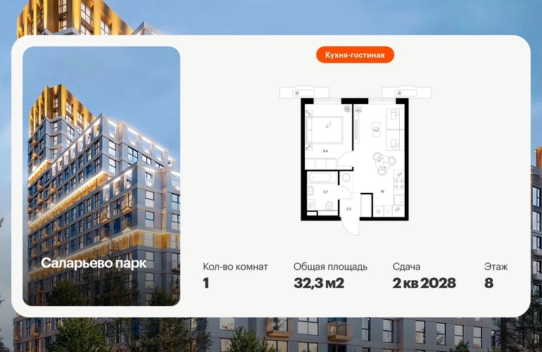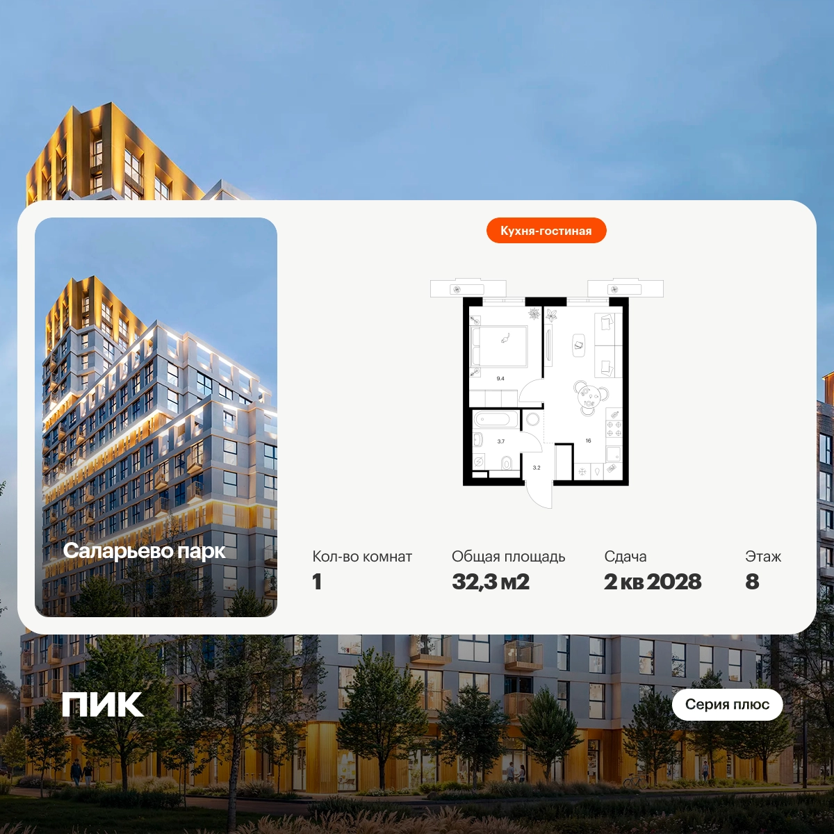 Продаётся 1-комн.квартира площадью 32.30 кв.м на 8 этаже 14 этажного дома (Корпус 57.5, секция 5) проекта ПИК Саларьево парк. Светлый просторный подъезд на уровне земли, функциональная планировка, большие окна, с отделкой. Жилой район «Саларьево парк» расположен в Новой Москве, в четырёх километрах от МКАД по Киевскому шоссе. Две станции метро: «Саларьево» и «Филатов луг» — находятся в пешей доступности от проекта. Дойти до них можно за 5–10 минут. В квартале уже создана качественная среда, где есть абсолютно всё для полноценной жизни, работы и отдыха. «Саларьево парк» — не просто квартал, а полноценный жилой район, который отличается разноплановой архитектурой. Над концепцией квартала работали несколько ведущих архитектурных бюро, которые стремились добиться разнообразия в фасадных решениях. Ярким примером такого подхода станет корпус 83, который относится к «Серии плюс». Новый корпус 83 был создан по принципам южной архитектуры: расслабленный и лаконичный силуэт зданий, привлекающий к себе внимание. Архитектурная изюминка 83-го корпуса — террасы и фигурные балконы. Вместе с окнами и другими акцентными элементами они создают уникальный облик здания, отсылая нас к изысканной южной архитектуре. Все корпуса в квартале гармонично сочетаются, образуя единую городскую среду. Здесь приятно гулять и проводить время на улице всей семьёй. В «Саларьево парке» создана уникальная образовательная среда, включающая в себя шесть школ, рассчитанных на 6 250 учеников. Две из них уже открыты, их посещает 2 300 детей. Также на территории «Саларьево парка» находится 12 детских садов, один из которых с бассейном. Сейчас уже открыты 7 садов. В «Саларьево парке» открыта уникальная игровая площадка — PlayHub «Оригами». Здесь есть ручей, горка-труба и рельефные холмы. Взрослые смогут отдохнуть в уютном кафе, пока дети играют. Также на территории проекта есть SportHub — большая спортивная зона, разделённая по интересам и возрастам. Здесь можно заниматься разными видами спорта: футболом, баскетболом, волейболом и стритболом. Зимой центральную часть площадки превращают в каток. Во дворах-парках жилого квартала есть места для отдыха, детские и спортивные площадки. На первых этажах домов расположены магазины, кафе и полезные сервисы. Также вблизи проекта есть несколько масштабных торговых центров. До ТЦ «Саларис» пять минут пешком, до «Рио», Metro Cash & Carry и «Лемана про» — пять минут на автомобиле. Артикул - 1018762О застройщике