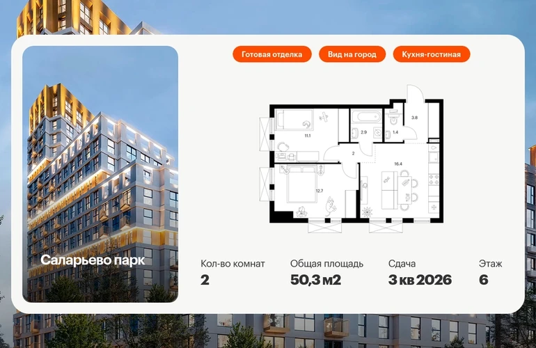 Продаётся 2-комн.квартира площадью 50.30 кв.м на 6 этаже 16 этажного дома (Корпус 20, секция 2) проекта ПИК Саларьево парк. Светлый просторный подъезд на уровне земли, функциональная планировка, большие окна, с отделкой. Жилой район «Саларьево парк» расположен в Новой Москве, в четырёх километрах от МКАД по Киевскому шоссе. Две станции метро: «Саларьево» и «Филатов луг», — находятся в пешей доступности от проекта. Дойти до них можно за 5–10 минут. В квартале уже создана качественная среда, где есть абсолютно всё для полноценной жизни, работы и отдыха. «Саларьево парк» — не просто квартал, а полноценный жилой район, который отличается разноплановой архитектурой. Над концепцией квартала работали несколько ведущих архитектурных бюро, которые стремились добиться разнообразия в фасадных решениях. Ярким примером такого подхода станут корпуса 82 и 83, которые относятся к «Серии плюс». Новый корпус 83 был создан по принципам южной архитектуры: расслабленный и лаконичный силуэт зданий, привлекающий к себе внимание. Архитектурная изюминка 83-го корпуса — террасы и фигурные балконы. Вместе с окнами и другими акцентными элементами они создают уникальный облик здания, отсылая нас к изысканной южной архитектуре. Все корпуса в квартале гармонично сочетаются, образуя единую городскую среду. Здесь приятно гулять и проводить время на улице всей семьёй. В «Саларьево парке» создана уникальная образовательная среда, включающая в себя шесть школ, рассчитанных на 6 250 учеников. Четыре из них уже открыты, их посещает 2 300 детей. Также на территории «Саларьево парка» находится 12 детских садов, один из которых с бассейном. Сейчас уже открыты 8 садов. В «Саларьево парке» открыта уникальная игровая площадка — PlayHub «Оригами». Здесь есть ручей, горка-труба и рельефные холмы. Взрослые смогут отдохнуть в уютном кафе, пока дети играют. Также на территории проекта есть SportHub — большая спортивная зона, разделённая по интересам и возрастам. Здесь можно заниматься разными видами спорта: футболом, баскетболом, волейболом и стритболом. Зимой центральную часть площадки превращают в каток. Во дворах-парках жилого квартала есть места для отдыха, детские и спортивные площадки. На первых этажах домов расположены магазины, кафе и полезные сервисы. Также вблизи проекта есть несколько масштабных торговых центров. До ТЦ «Саларис» пять минут пешком, до «Рио», Metro Cash & Carry и «Леруа Мерлен» — пять минут на автомобиле. Артикул - 946878О застройщике
