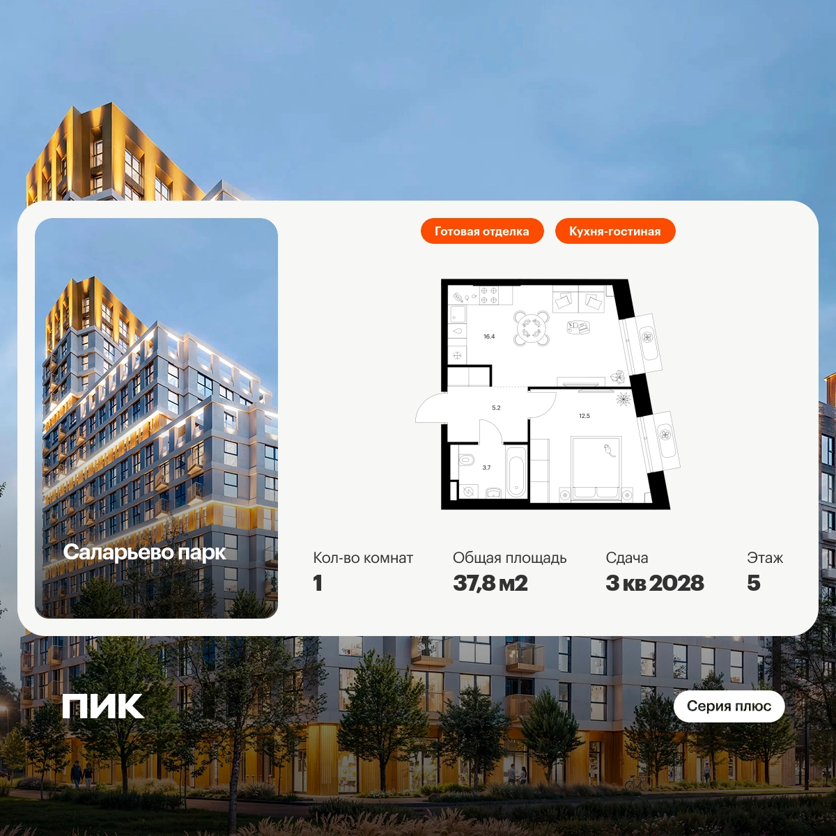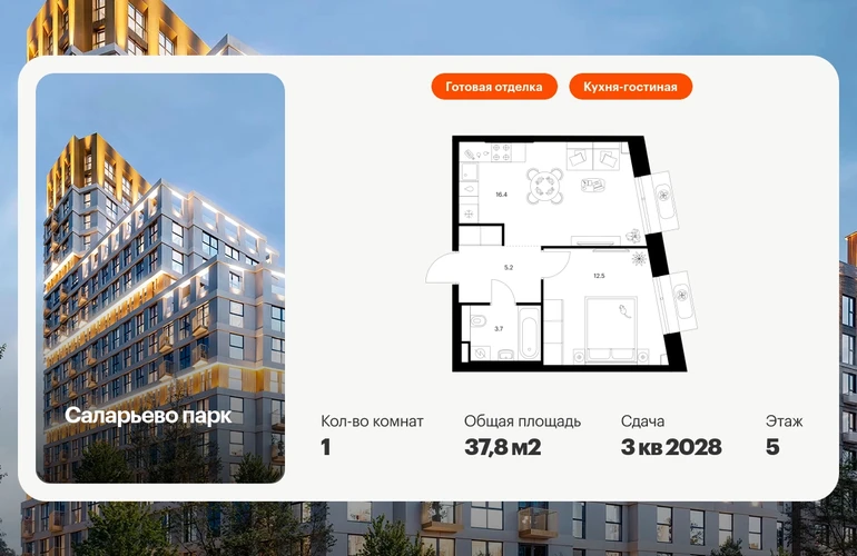 Продаётся 1-комн.квартира площадью 37.80 кв.м на 5 этаже 22 этажного дома (Корпус 73, секция 1) проекта ПИК Саларьево парк. Светлый просторный подъезд на уровне земли, функциональная планировка, большие окна, с отделкой. Жилой район «Саларьево парк» расположен в Новой Москве, в четырёх километрах от МКАД по Киевскому шоссе. Две станции метро: «Саларьево» и «Филатов луг», — находятся в пешей доступности от проекта. Дойти до них можно за 5–10 минут. В квартале уже создана качественная среда, где есть абсолютно всё для полноценной жизни, работы и отдыха. «Саларьево парк» — не просто квартал, а полноценный жилой район, который отличается разноплановой архитектурой. Над концепцией квартала работали несколько ведущих архитектурных бюро, которые стремились добиться разнообразия в фасадных решениях. Ярким примером такого подхода станут корпуса 82 и 83, которые относятся к «Серии плюс». Новый корпус 83 был создан по принципам южной архитектуры: расслабленный и лаконичный силуэт зданий, привлекающий к себе внимание. Архитектурная изюминка 83-го корпуса — террасы и фигурные балконы. Вместе с окнами и другими акцентными элементами они создают уникальный облик здания, отсылая нас к изысканной южной архитектуре. Все корпуса в квартале гармонично сочетаются, образуя единую городскую среду. Здесь приятно гулять и проводить время на улице всей семьёй. В «Саларьево парке» создана уникальная образовательная среда, включающая в себя шесть школ, рассчитанных на 6 250 учеников. Четыре из них уже открыты, их посещает 2 300 детей. Также на территории «Саларьево парка» находится 12 детских садов, один из которых с бассейном. Сейчас уже открыты 8 садов. В «Саларьево парке» открыта уникальная игровая площадка — PlayHub «Оригами». Здесь есть ручей, горка-труба и рельефные холмы. Взрослые смогут отдохнуть в уютном кафе, пока дети играют. Также на территории проекта есть SportHub — большая спортивная зона, разделённая по интересам и возрастам. Здесь можно заниматься разными видами спорта: футболом, баскетболом, волейболом и стритболом. Зимой центральную часть площадки превращают в каток. Во дворах-парках жилого квартала есть места для отдыха, детские и спортивные площадки. На первых этажах домов расположены магазины, кафе и полезные сервисы. Также вблизи проекта есть несколько масштабных торговых центров. До ТЦ «Саларис» пять минут пешком, до «Рио», Metro Cash & Carry и «Леруа Мерлен» — пять минут на автомобиле. Артикул - 1016402О застройщике