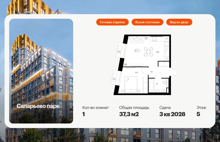 Продаётся 1-комн.квартира площадью 37.30 кв.м на 5 этаже 22 этажного дома (Корпус 73, секция 1) проекта ПИК Саларьево парк. Светлый просторный подъезд на уровне земли, функциональная планировка, большие окна, с отделкой. Жилой район «Саларьево парк» расположен в Новой Москве, в четырёх километрах от МКАД по Киевскому шоссе. Две станции метро: «Саларьево» и «Филатов луг», — находятся в пешей доступности от проекта. Дойти до них можно за 5–10 минут. В квартале уже создана качественная среда, где есть абсолютно всё для полноценной жизни, работы и отдыха. «Саларьево парк» — не просто квартал, а полноценный жилой район, который отличается разноплановой архитектурой. Над концепцией квартала работали несколько ведущих архитектурных бюро, которые стремились добиться разнообразия в фасадных решениях. Ярким примером такого подхода станут корпуса 82 и 83, которые относятся к «Серии плюс». Новый корпус 83 был создан по принципам южной архитектуры: расслабленный и лаконичный силуэт зданий, привлекающий к себе внимание. Архитектурная изюминка 83-го корпуса — террасы и фигурные балконы. Вместе с окнами и другими акцентными элементами они создают уникальный облик здания, отсылая нас к изысканной южной архитектуре. Все корпуса в квартале гармонично сочетаются, образуя единую городскую среду. Здесь приятно гулять и проводить время на улице всей семьёй. В «Саларьево парке» создана уникальная образовательная среда, включающая в себя шесть школ, рассчитанных на 6 250 учеников. Четыре из них уже открыты, их посещает 2 300 детей. Также на территории «Саларьево парка» находится 12 детских садов, один из которых с бассейном. Сейчас уже открыты 8 садов. В «Саларьево парке» открыта уникальная игровая площадка — PlayHub «Оригами». Здесь есть ручей, горка-труба и рельефные холмы. Взрослые смогут отдохнуть в уютном кафе, пока дети играют. Также на территории проекта есть SportHub — большая спортивная зона, разделённая по интересам и возрастам. Здесь можно заниматься разными видами спорта: футболом, баскетболом, волейболом и стритболом. Зимой центральную часть площадки превращают в каток. Во дворах-парках жилого квартала есть места для отдыха, детские и спортивные площадки. На первых этажах домов расположены магазины, кафе и полезные сервисы. Также вблизи проекта есть несколько масштабных торговых центров. До ТЦ «Саларис» пять минут пешком, до «Рио», Metro Cash & Carry и «Леруа Мерлен» — пять минут на автомобиле. Артикул - 1016410О застройщике
