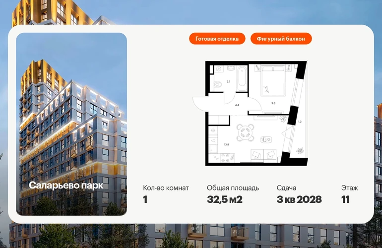 Продаётся 1-комн.квартира площадью 32.50 кв.м на 11 этаже 22 этажного дома (Корпус 73, секция 1) проекта ПИК Саларьево парк. Светлый просторный подъезд на уровне земли, функциональная планировка, большие окна, с отделкой. Жилой район «Саларьево парк» расположен в Новой Москве, в четырёх километрах от МКАД по Киевскому шоссе. Две станции метро: «Саларьево» и «Филатов луг», — находятся в пешей доступности от проекта. Дойти до них можно за 5–10 минут. В квартале уже создана качественная среда, где есть абсолютно всё для полноценной жизни, работы и отдыха. «Саларьево парк» — не просто квартал, а полноценный жилой район, который отличается разноплановой архитектурой. Над концепцией квартала работали несколько ведущих архитектурных бюро, которые стремились добиться разнообразия в фасадных решениях. Ярким примером такого подхода станут корпуса 82 и 83, которые относятся к «Серии плюс». Новый корпус 83 был создан по принципам южной архитектуры: расслабленный и лаконичный силуэт зданий, привлекающий к себе внимание. Архитектурная изюминка 83-го корпуса — террасы и фигурные балконы. Вместе с окнами и другими акцентными элементами они создают уникальный облик здания, отсылая нас к изысканной южной архитектуре. Все корпуса в квартале гармонично сочетаются, образуя единую городскую среду. Здесь приятно гулять и проводить время на улице всей семьёй. В «Саларьево парке» создана уникальная образовательная среда, включающая в себя шесть школ, рассчитанных на 6 250 учеников. Четыре из них уже открыты, их посещает 2 300 детей. Также на территории «Саларьево парка» находится 12 детских садов, один из которых с бассейном. Сейчас уже открыты 8 садов. В «Саларьево парке» открыта уникальная игровая площадка — PlayHub «Оригами». Здесь есть ручей, горка-труба и рельефные холмы. Взрослые смогут отдохнуть в уютном кафе, пока дети играют. Также на территории проекта есть SportHub — большая спортивная зона, разделённая по интересам и возрастам. Здесь можно заниматься разными видами спорта: футболом, баскетболом, волейболом и стритболом. Зимой центральную часть площадки превращают в каток. Во дворах-парках жилого квартала есть места для отдыха, детские и спортивные площадки. На первых этажах домов расположены магазины, кафе и полезные сервисы. Также вблизи проекта есть несколько масштабных торговых центров. До ТЦ «Саларис» пять минут пешком, до «Рио», Metro Cash & Carry и «Леруа Мерлен» — пять минут на автомобиле. Артикул - 1016474О застройщике
