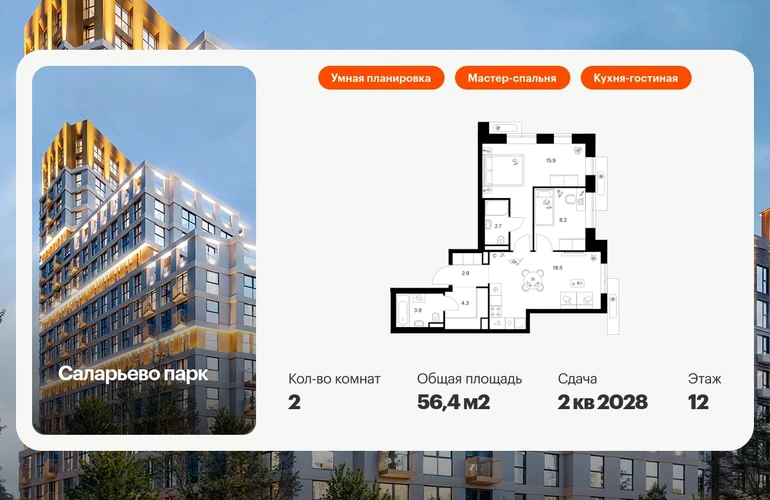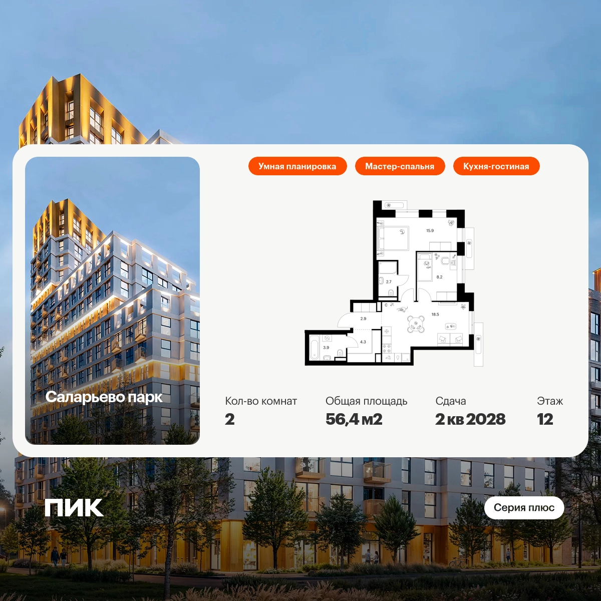 Продаётся 2-комн.квартира площадью 56.40 кв.м на 12 этаже 22 этажного дома (Корпус 57.3, секция 3) проекта ПИК Саларьево парк. Светлый просторный подъезд на уровне земли, функциональная планировка, большие окна, с отделкой. Жилой район «Саларьево парк» расположен в Новой Москве, в четырёх километрах от МКАД по Киевскому шоссе. Две станции метро: «Саларьево» и «Филатов луг», — находятся в пешей доступности от проекта. Дойти до них можно за 5–10 минут. В квартале уже создана качественная среда, где есть абсолютно всё для полноценной жизни, работы и отдыха. «Саларьево парк» — не просто квартал, а полноценный жилой район, который отличается разноплановой архитектурой. Над концепцией квартала работали несколько ведущих архитектурных бюро, которые стремились добиться разнообразия в фасадных решениях. Ярким примером такого подхода станут корпуса 82 и 83, которые относятся к «Серии плюс». Новый корпус 83 был создан по принципам южной архитектуры: расслабленный и лаконичный силуэт зданий, привлекающий к себе внимание. Архитектурная изюминка 83-го корпуса — террасы и фигурные балконы. Вместе с окнами и другими акцентными элементами они создают уникальный облик здания, отсылая нас к изысканной южной архитектуре. Все корпуса в квартале гармонично сочетаются, образуя единую городскую среду. Здесь приятно гулять и проводить время на улице всей семьёй. В «Саларьево парке» создана уникальная образовательная среда, включающая в себя шесть школ, рассчитанных на 6 250 учеников. Четыре из них уже открыты, их посещает 2 300 детей. Также на территории «Саларьево парка» находится 12 детских садов, один из которых с бассейном. Сейчас уже открыты 8 садов. В «Саларьево парке» открыта уникальная игровая площадка — PlayHub «Оригами». Здесь есть ручей, горка-труба и рельефные холмы. Взрослые смогут отдохнуть в уютном кафе, пока дети играют. Также на территории проекта есть SportHub — большая спортивная зона, разделённая по интересам и возрастам. Здесь можно заниматься разными видами спорта: футболом, баскетболом, волейболом и стритболом. Зимой центральную часть площадки превращают в каток. Во дворах-парках жилого квартала есть места для отдыха, детские и спортивные площадки. На первых этажах домов расположены магазины, кафе и полезные сервисы. Также вблизи проекта есть несколько масштабных торговых центров. До ТЦ «Саларис» пять минут пешком, до «Рио», Metro Cash & Carry и «Леруа Мерлен» — пять минут на автомобиле. Артикул - 1018424О застройщике