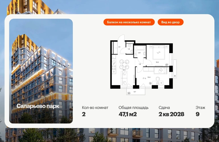 Продаётся 2-комн.квартира площадью 47.10 кв.м на 9 этаже 16 этажного дома (Корпус 57.4, секция 4) проекта ПИК Саларьево парк. Светлый просторный подъезд на уровне земли, функциональная планировка, большие окна, с отделкой. Артикул - 1018608О застройщике