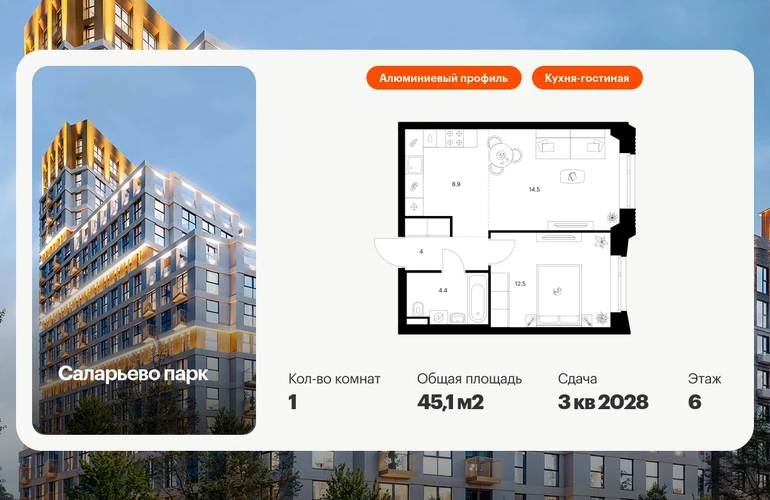 Продаётся 1-комн.квартира площадью 45.10 кв.м на 6 этаже 23 этажного дома (Корпус 69.1, секция 1) проекта ПИК Саларьево парк. Светлый просторный подъезд на уровне земли, функциональная планировка, большие окна, с отделкой. Жилой район «Саларьево парк» расположен в Новой Москве, в четырёх километрах от МКАД по Киевскому шоссе. Две станции метро: «Саларьево» и «Филатов луг» — находятся в пешей доступности от проекта. Дойти до них можно за 5–10 минут. В квартале уже создана качественная среда, где есть абсолютно всё для полноценной жизни, работы и отдыха. «Саларьево парк» — не просто квартал, а полноценный жилой район, который отличается разноплановой архитектурой. Над концепцией квартала работали несколько ведущих архитектурных бюро, которые стремились добиться разнообразия в фасадных решениях. Ярким примером такого подхода станет корпус 83, который относится к «Серии плюс». Новый корпус 83 был создан по принципам южной архитектуры: расслабленный и лаконичный силуэт зданий, привлекающий к себе внимание. Архитектурная изюминка 83-го корпуса — террасы и фигурные балконы. Вместе с окнами и другими акцентными элементами они создают уникальный облик здания, отсылая нас к изысканной южной архитектуре. Все корпуса в квартале гармонично сочетаются, образуя единую городскую среду. Здесь приятно гулять и проводить время на улице всей семьёй. В «Саларьево парке» создана уникальная образовательная среда, включающая в себя шесть школ, рассчитанных на 6 250 учеников. Две из них уже открыты, их посещает 2 300 детей. Также на территории «Саларьево парка» находится 12 детских садов, один из которых с бассейном. Сейчас уже открыты 7 садов. В «Саларьево парке» открыта уникальная игровая площадка — PlayHub «Оригами». Здесь есть ручей, горка-труба и рельефные холмы. Взрослые смогут отдохнуть в уютном кафе, пока дети играют. Также на территории проекта есть SportHub — большая спортивная зона, разделённая по интересам и возрастам. Здесь можно заниматься разными видами спорта: футболом, баскетболом, волейболом и стритболом. Зимой центральную часть площадки превращают в каток. Во дворах-парках жилого квартала есть места для отдыха, детские и спортивные площадки. На первых этажах домов расположены магазины, кафе и полезные сервисы. Также вблизи проекта есть несколько масштабных торговых центров. До ТЦ «Саларис» пять минут пешком, до «Рио», Metro Cash & Carry и «Лемана про» — пять минут на автомобиле. Артикул - 1023231О застройщике