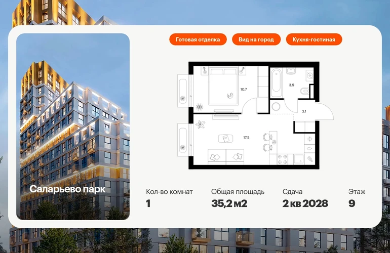 Продаётся 1-комн.квартира площадью 35.20 кв.м на 9 этаже 18 этажного дома (Корпус 74.9, секция 9) проекта ПИК Саларьево парк. Светлый просторный подъезд на уровне земли, функциональная планировка, большие окна, с отделкой. Жилой район «Саларьево парк» расположен в Новой Москве, в четырёх километрах от МКАД по Киевскому шоссе. Две станции метро: «Саларьево» и «Филатов луг», — находятся в пешей доступности от проекта. Дойти до них можно за 5–10 минут. В квартале уже создана качественная среда, где есть абсолютно всё для полноценной жизни, работы и отдыха. «Саларьево парк» — не просто квартал, а полноценный жилой район, который отличается разноплановой архитектурой. Над концепцией квартала работали несколько ведущих архитектурных бюро, которые стремились добиться разнообразия в фасадных решениях. Ярким примером такого подхода станут корпуса 82 и 83, которые относятся к «Серии плюс». Новый корпус 83 был создан по принципам южной архитектуры: расслабленный и лаконичный силуэт зданий, привлекающий к себе внимание. Архитектурная изюминка 83-го корпуса — террасы и фигурные балконы. Вместе с окнами и другими акцентными элементами они создают уникальный облик здания, отсылая нас к изысканной южной архитектуре. Все корпуса в квартале гармонично сочетаются, образуя единую городскую среду. Здесь приятно гулять и проводить время на улице всей семьёй. В «Саларьево парке» создана уникальная образовательная среда, включающая в себя шесть школ, рассчитанных на 6 250 учеников. Четыре из них уже открыты, их посещает 2 300 детей. Также на территории «Саларьево парка» находится 12 детских садов, один из которых с бассейном. Сейчас уже открыты 8 садов. В «Саларьево парке» открыта уникальная игровая площадка — PlayHub «Оригами». Здесь есть ручей, горка-труба и рельефные холмы. Взрослые смогут отдохнуть в уютном кафе, пока дети играют. Также на территории проекта есть SportHub — большая спортивная зона, разделённая по интересам и возрастам. Здесь можно заниматься разными видами спорта: футболом, баскетболом, волейболом и стритболом. Зимой центральную часть площадки превращают в каток. Во дворах-парках жилого квартала есть места для отдыха, детские и спортивные площадки. На первых этажах домов расположены магазины, кафе и полезные сервисы. Также вблизи проекта есть несколько масштабных торговых центров. До ТЦ «Саларис» пять минут пешком, до «Рио», Metro Cash & Carry и «Леруа Мерлен» — пять минут на автомобиле. Артикул - 1007349О застройщике