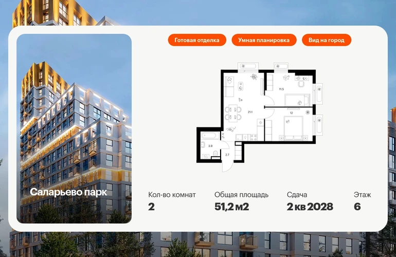 Продаётся 2-комн.квартира площадью 51.20 кв.м на 6 этаже 18 этажного дома (Корпус 74.9, секция 9) проекта ПИК Саларьево парк. Светлый просторный подъезд на уровне земли, функциональная планировка, большие окна, с отделкой. Жилой район «Саларьево парк» расположен в Новой Москве, в четырёх километрах от МКАД по Киевскому шоссе. Две станции метро: «Саларьево» и «Филатов луг» — находятся в пешей доступности от проекта. Дойти до них можно за 5–10 минут. В квартале уже создана качественная среда, где есть абсолютно всё для полноценной жизни, работы и отдыха. «Саларьево парк» — не просто квартал, а полноценный жилой район, который отличается разноплановой архитектурой. Над концепцией квартала работали несколько ведущих архитектурных бюро, которые стремились добиться разнообразия в фасадных решениях. Ярким примером такого подхода станет корпус 83, который относится к «Серии плюс». Новый корпус 83 был создан по принципам южной архитектуры: расслабленный и лаконичный силуэт зданий, привлекающий к себе внимание. Архитектурная изюминка 83-го корпуса — террасы и фигурные балконы. Вместе с окнами и другими акцентными элементами они создают уникальный облик здания, отсылая нас к изысканной южной архитектуре. Все корпуса в квартале гармонично сочетаются, образуя единую городскую среду. Здесь приятно гулять и проводить время на улице всей семьёй. В «Саларьево парке» создана уникальная образовательная среда, включающая в себя шесть школ, рассчитанных на 6 250 учеников. Две из них уже открыты, их посещает 2 300 детей. Также на территории «Саларьево парка» находится 12 детских садов, один из которых с бассейном. Сейчас уже открыты 7 садов. В «Саларьево парке» открыта уникальная игровая площадка — PlayHub «Оригами». Здесь есть ручей, горка-труба и рельефные холмы. Взрослые смогут отдохнуть в уютном кафе, пока дети играют. Также на территории проекта есть SportHub — большая спортивная зона, разделённая по интересам и возрастам. Здесь можно заниматься разными видами спорта: футболом, баскетболом, волейболом и стритболом. Зимой центральную часть площадки превращают в каток. Во дворах-парках жилого квартала есть места для отдыха, детские и спортивные площадки. На первых этажах домов расположены магазины, кафе и полезные сервисы. Также вблизи проекта есть несколько масштабных торговых центров. До ТЦ «Саларис» пять минут пешком, до «Рио», Metro Cash & Carry и «Лемана про» — пять минут на автомобиле. Артикул - 1007320О застройщике