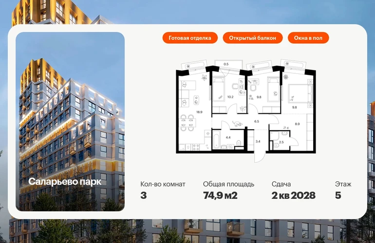 Продаётся 3-комн.квартира площадью 74.90 кв.м на 5 этаже 18 этажного дома (Корпус 74.6, секция 6) проекта ПИК Саларьево парк. Светлый просторный подъезд на уровне земли, функциональная планировка, большие окна, с отделкой. Жилой район «Саларьево парк» расположен в Новой Москве, в четырёх километрах от МКАД по Киевскому шоссе. Две станции метро: «Саларьево» и «Филатов луг», — находятся в пешей доступности от проекта. Дойти до них можно за 5–10 минут. В квартале уже создана качественная среда, где есть абсолютно всё для полноценной жизни, работы и отдыха. «Саларьево парк» — не просто квартал, а полноценный жилой район, который отличается разноплановой архитектурой. Над концепцией квартала работали несколько ведущих архитектурных бюро, которые стремились добиться разнообразия в фасадных решениях. Ярким примером такого подхода станут корпуса 82 и 83, которые относятся к «Серии плюс». Новый корпус 83 был создан по принципам южной архитектуры: расслабленный и лаконичный силуэт зданий, привлекающий к себе внимание. Архитектурная изюминка 83-го корпуса — террасы и фигурные балконы. Вместе с окнами и другими акцентными элементами они создают уникальный облик здания, отсылая нас к изысканной южной архитектуре. Все корпуса в квартале гармонично сочетаются, образуя единую городскую среду. Здесь приятно гулять и проводить время на улице всей семьёй. В «Саларьево парке» создана уникальная образовательная среда, включающая в себя шесть школ, рассчитанных на 6 250 учеников. Четыре из них уже открыты, их посещает 2 300 детей. Также на территории «Саларьево парка» находится 12 детских садов, один из которых с бассейном. Сейчас уже открыты 8 садов. В «Саларьево парке» открыта уникальная игровая площадка — PlayHub «Оригами». Здесь есть ручей, горка-труба и рельефные холмы. Взрослые смогут отдохнуть в уютном кафе, пока дети играют. Также на территории проекта есть SportHub — большая спортивная зона, разделённая по интересам и возрастам. Здесь можно заниматься разными видами спорта: футболом, баскетболом, волейболом и стритболом. Зимой центральную часть площадки превращают в каток. Во дворах-парках жилого квартала есть места для отдыха, детские и спортивные площадки. На первых этажах домов расположены магазины, кафе и полезные сервисы. Также вблизи проекта есть несколько масштабных торговых центров. До ТЦ «Саларис» пять минут пешком, до «Рио», Metro Cash & Carry и «Леруа Мерлен» — пять минут на автомобиле. Артикул - 1006805О застройщике