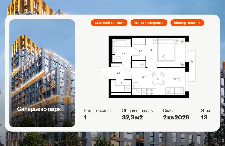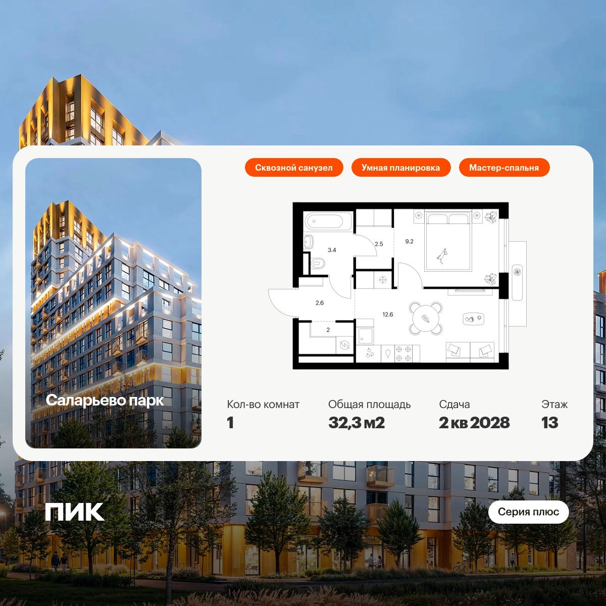 Продаётся 1-комн.квартира площадью 32.30 кв.м на 13 этаже 22 этажного дома (Корпус 57.3, секция 3) проекта ПИК Саларьево парк. Светлый просторный подъезд на уровне земли, функциональная планировка, большие окна, с отделкой. Жилой район «Саларьево парк» расположен в Новой Москве, в четырёх километрах от МКАД по Киевскому шоссе. Две станции метро: «Саларьево» и «Филатов луг», — находятся в пешей доступности от проекта. Дойти до них можно за 5–10 минут. В квартале уже создана качественная среда, где есть абсолютно всё для полноценной жизни, работы и отдыха. «Саларьево парк» — не просто квартал, а полноценный жилой район, который отличается разноплановой архитектурой. Над концепцией квартала работали несколько ведущих архитектурных бюро, которые стремились добиться разнообразия в фасадных решениях. Ярким примером такого подхода станут корпуса 82 и 83, которые относятся к «Серии плюс». Новый корпус 83 был создан по принципам южной архитектуры: расслабленный и лаконичный силуэт зданий, привлекающий к себе внимание. Архитектурная изюминка 83-го корпуса — террасы и фигурные балконы. Вместе с окнами и другими акцентными элементами они создают уникальный облик здания, отсылая нас к изысканной южной архитектуре. Все корпуса в квартале гармонично сочетаются, образуя единую городскую среду. Здесь приятно гулять и проводить время на улице всей семьёй. В «Саларьево парке» создана уникальная образовательная среда, включающая в себя шесть школ, рассчитанных на 6 250 учеников. Четыре из них уже открыты, их посещает 2 300 детей. Также на территории «Саларьево парка» находится 12 детских садов, один из которых с бассейном. Сейчас уже открыты 8 садов. В «Саларьево парке» открыта уникальная игровая площадка — PlayHub «Оригами». Здесь есть ручей, горка-труба и рельефные холмы. Взрослые смогут отдохнуть в уютном кафе, пока дети играют. Также на территории проекта есть SportHub — большая спортивная зона, разделённая по интересам и возрастам. Здесь можно заниматься разными видами спорта: футболом, баскетболом, волейболом и стритболом. Зимой центральную часть площадки превращают в каток. Во дворах-парках жилого квартала есть места для отдыха, детские и спортивные площадки. На первых этажах домов расположены магазины, кафе и полезные сервисы. Также вблизи проекта есть несколько масштабных торговых центров. До ТЦ «Саларис» пять минут пешком, до «Рио», Metro Cash & Carry и «Леруа Мерлен» — пять минут на автомобиле. Артикул - 1018436О застройщике