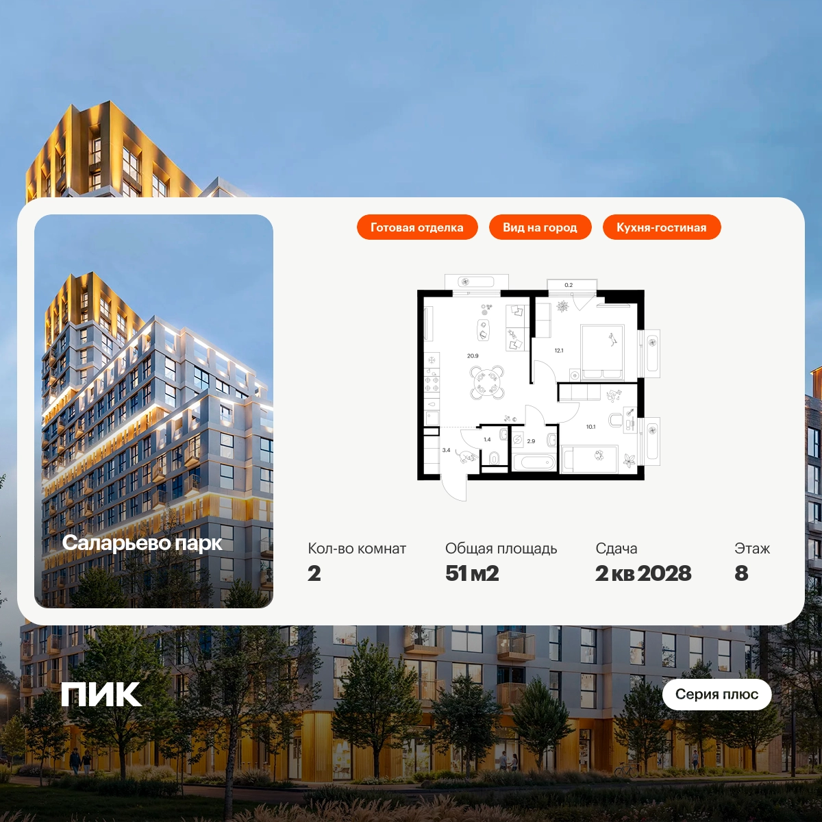 Продаётся 2-комн.квартира площадью 51.00 кв.м на 8 этаже 18 этажного дома (Корпус 74.1, секция 1) проекта ПИК Саларьево парк. Светлый просторный подъезд на уровне земли, функциональная планировка, большие окна, с отделкой. Жилой район «Саларьево парк» расположен в Новой Москве, в четырёх километрах от МКАД по Киевскому шоссе. Две станции метро: «Саларьево» и «Филатов луг», — находятся в пешей доступности от проекта. Дойти до них можно за 5–10 минут. В квартале уже создана качественная среда, где есть абсолютно всё для полноценной жизни, работы и отдыха. «Саларьево парк» — не просто квартал, а полноценный жилой район, который отличается разноплановой архитектурой. Над концепцией квартала работали несколько ведущих архитектурных бюро, которые стремились добиться разнообразия в фасадных решениях. Ярким примером такого подхода станут корпуса 82 и 83, которые относятся к «Серии плюс». Новый корпус 83 был создан по принципам южной архитектуры: расслабленный и лаконичный силуэт зданий, привлекающий к себе внимание. Архитектурная изюминка 83-го корпуса — террасы и фигурные балконы. Вместе с окнами и другими акцентными элементами они создают уникальный облик здания, отсылая нас к изысканной южной архитектуре. Все корпуса в квартале гармонично сочетаются, образуя единую городскую среду. Здесь приятно гулять и проводить время на улице всей семьёй. В «Саларьево парке» создана уникальная образовательная среда, включающая в себя шесть школ, рассчитанных на 6 250 учеников. Четыре из них уже открыты, их посещает 2 300 детей. Также на территории «Саларьево парка» находится 12 детских садов, один из которых с бассейном. Сейчас уже открыты 8 садов. В «Саларьево парке» открыта уникальная игровая площадка — PlayHub «Оригами». Здесь есть ручей, горка-труба и рельефные холмы. Взрослые смогут отдохнуть в уютном кафе, пока дети играют. Также на территории проекта есть SportHub — большая спортивная зона, разделённая по интересам и возрастам. Здесь можно заниматься разными видами спорта: футболом, баскетболом, волейболом и стритболом. Зимой центральную часть площадки превращают в каток. Во дворах-парках жилого квартала есть места для отдыха, детские и спортивные площадки. На первых этажах домов расположены магазины, кафе и полезные сервисы. Также вблизи проекта есть несколько масштабных торговых центров. До ТЦ «Саларис» пять минут пешком, до «Рио», Metro Cash & Carry и «Леруа Мерлен» — пять минут на автомобиле. Артикул - 1006122О застройщике