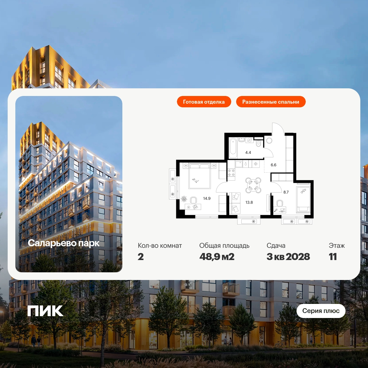 Продаётся 2-комн.квартира площадью 48.90 кв.м на 11 этаже 14 этажного дома (Корпус 69.6, секция 6) проекта ПИК Саларьево парк. Светлый просторный подъезд на уровне земли, функциональная планировка, большие окна, с отделкой. Жилой район «Саларьево парк» расположен в Новой Москве, в четырёх километрах от МКАД по Киевскому шоссе. Две станции метро: «Саларьево» и «Филатов луг», — находятся в пешей доступности от проекта. Дойти до них можно за 5–10 минут. В квартале уже создана качественная среда, где есть абсолютно всё для полноценной жизни, работы и отдыха. «Саларьево парк» — не просто квартал, а полноценный жилой район, который отличается разноплановой архитектурой. Над концепцией квартала работали несколько ведущих архитектурных бюро, которые стремились добиться разнообразия в фасадных решениях. Ярким примером такого подхода станут корпуса 82 и 83, которые относятся к «Серии плюс». Новый корпус 83 был создан по принципам южной архитектуры: расслабленный и лаконичный силуэт зданий, привлекающий к себе внимание. Архитектурная изюминка 83-го корпуса — террасы и фигурные балконы. Вместе с окнами и другими акцентными элементами они создают уникальный облик здания, отсылая нас к изысканной южной архитектуре. Все корпуса в квартале гармонично сочетаются, образуя единую городскую среду. Здесь приятно гулять и проводить время на улице всей семьёй. В «Саларьево парке» создана уникальная образовательная среда, включающая в себя шесть школ, рассчитанных на 6 250 учеников. Четыре из них уже открыты, их посещает 2 300 детей. Также на территории «Саларьево парка» находится 12 детских садов, один из которых с бассейном. Сейчас уже открыты 8 садов. В «Саларьево парке» открыта уникальная игровая площадка — PlayHub «Оригами». Здесь есть ручей, горка-труба и рельефные холмы. Взрослые смогут отдохнуть в уютном кафе, пока дети играют. Также на территории проекта есть SportHub — большая спортивная зона, разделённая по интересам и возрастам. Здесь можно заниматься разными видами спорта: футболом, баскетболом, волейболом и стритболом. Зимой центральную часть площадки превращают в каток. Во дворах-парках жилого квартала есть места для отдыха, детские и спортивные площадки. На первых этажах домов расположены магазины, кафе и полезные сервисы. Также вблизи проекта есть несколько масштабных торговых центров. До ТЦ «Саларис» пять минут пешком, до «Рио», Metro Cash & Carry и «Леруа Мерлен» — пять минут на автомобиле. Артикул - 1024070О застройщике