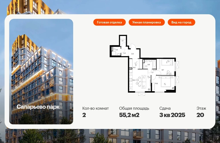 Продаётся 2-комн.квартира площадью 55.20 кв.м на 20 этаже 24 этажного дома (Корпус 68.5, секция 5) проекта ПИК Саларьево парк. Светлый просторный подъезд на уровне земли, функциональная планировка, большие окна, с отделкой. Жилой район «Саларьево парк» расположен в Новой Москве, в четырёх километрах от МКАД по Киевскому шоссе. Две станции метро: «Саларьево» и «Филатов луг» — находятся в пешей доступности от проекта. Дойти до них можно за 5–10 минут. В квартале уже создана качественная среда, где есть абсолютно всё для полноценной жизни, работы и отдыха. «Саларьево парк» — не просто квартал, а полноценный жилой район, который отличается разноплановой архитектурой. Над концепцией квартала работали несколько ведущих архитектурных бюро, которые стремились добиться разнообразия в фасадных решениях. Ярким примером такого подхода станет корпус 83, который относится к «Серии плюс». Новый корпус 83 был создан по принципам южной архитектуры: расслабленный и лаконичный силуэт зданий, привлекающий к себе внимание. Архитектурная изюминка 83-го корпуса — террасы и фигурные балконы. Вместе с окнами и другими акцентными элементами они создают уникальный облик здания, отсылая нас к изысканной южной архитектуре. Все корпуса в квартале гармонично сочетаются, образуя единую городскую среду. Здесь приятно гулять и проводить время на улице всей семьёй. В «Саларьево парке» создана уникальная образовательная среда, включающая в себя шесть школ, рассчитанных на 6 250 учеников. Две из них уже открыты, их посещает 2 300 детей. Также на территории «Саларьево парка» находится 12 детских садов, один из которых с бассейном. Сейчас уже открыты 7 садов. В «Саларьево парке» открыта уникальная игровая площадка — PlayHub «Оригами». Здесь есть ручей, горка-труба и рельефные холмы. Взрослые смогут отдохнуть в уютном кафе, пока дети играют. Также на территории проекта есть SportHub — большая спортивная зона, разделённая по интересам и возрастам. Здесь можно заниматься разными видами спорта: футболом, баскетболом, волейболом и стритболом. Зимой центральную часть площадки превращают в каток. Во дворах-парках жилого квартала есть места для отдыха, детские и спортивные площадки. На первых этажах домов расположены магазины, кафе и полезные сервисы. Также вблизи проекта есть несколько масштабных торговых центров. До ТЦ «Саларис» пять минут пешком, до «Рио», Metro Cash & Carry и «Лемана про» — пять минут на автомобиле. Артикул - 868219О застройщике