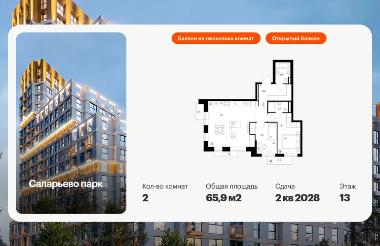 Продаётся 2-комн.квартира площадью 65.90 кв.м на 13 этаже 22 этажного дома (Корпус 57.3, секция 3) проекта ПИК Саларьево парк. Светлый просторный подъезд на уровне земли, функциональная планировка, большие окна, с отделкой. Жилой район «Саларьево парк» расположен в Новой Москве, в четырёх километрах от МКАД по Киевскому шоссе. Две станции метро: «Саларьево» и «Филатов луг», — находятся в пешей доступности от проекта. Дойти до них можно за 5–10 минут. В квартале уже создана качественная среда, где есть абсолютно всё для полноценной жизни, работы и отдыха. «Саларьево парк» — не просто квартал, а полноценный жилой район, который отличается разноплановой архитектурой. Над концепцией квартала работали несколько ведущих архитектурных бюро, которые стремились добиться разнообразия в фасадных решениях. Ярким примером такого подхода станут корпуса 82 и 83, которые относятся к «Серии плюс». Новый корпус 83 был создан по принципам южной архитектуры: расслабленный и лаконичный силуэт зданий, привлекающий к себе внимание. Архитектурная изюминка 83-го корпуса — террасы и фигурные балконы. Вместе с окнами и другими акцентными элементами они создают уникальный облик здания, отсылая нас к изысканной южной архитектуре. Все корпуса в квартале гармонично сочетаются, образуя единую городскую среду. Здесь приятно гулять и проводить время на улице всей семьёй. В «Саларьево парке» создана уникальная образовательная среда, включающая в себя шесть школ, рассчитанных на 6 250 учеников. Четыре из них уже открыты, их посещает 2 300 детей. Также на территории «Саларьево парка» находится 12 детских садов, один из которых с бассейном. Сейчас уже открыты 8 садов. В «Саларьево парке» открыта уникальная игровая площадка — PlayHub «Оригами». Здесь есть ручей, горка-труба и рельефные холмы. Взрослые смогут отдохнуть в уютном кафе, пока дети играют. Также на территории проекта есть SportHub — большая спортивная зона, разделённая по интересам и возрастам. Здесь можно заниматься разными видами спорта: футболом, баскетболом, волейболом и стритболом. Зимой центральную часть площадки превращают в каток. Во дворах-парках жилого квартала есть места для отдыха, детские и спортивные площадки. На первых этажах домов расположены магазины, кафе и полезные сервисы. Также вблизи проекта есть несколько масштабных торговых центров. До ТЦ «Саларис» пять минут пешком, до «Рио», Metro Cash & Carry и «Леруа Мерлен» — пять минут на автомобиле. Артикул - 1018425О застройщике