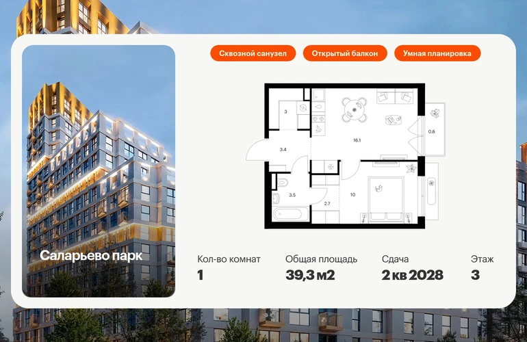 Продаётся 1-комн.квартира площадью 39.30 кв.м на 3 этаже 22 этажного дома (Корпус 57.3, секция 3) проекта ПИК Саларьево парк. Светлый просторный подъезд на уровне земли, функциональная планировка, большие окна, с отделкой. Жилой район «Саларьево парк» расположен в Новой Москве, в четырёх километрах от МКАД по Киевскому шоссе. Две станции метро: «Саларьево» и «Филатов луг», — находятся в пешей доступности от проекта. Дойти до них можно за 5–10 минут. В квартале уже создана качественная среда, где есть абсолютно всё для полноценной жизни, работы и отдыха. «Саларьево парк» — не просто квартал, а полноценный жилой район, который отличается разноплановой архитектурой. Над концепцией квартала работали несколько ведущих архитектурных бюро, которые стремились добиться разнообразия в фасадных решениях. Ярким примером такого подхода станут корпуса 82 и 83, которые относятся к «Серии плюс». Новый корпус 83 был создан по принципам южной архитектуры: расслабленный и лаконичный силуэт зданий, привлекающий к себе внимание. Архитектурная изюминка 83-го корпуса — террасы и фигурные балконы. Вместе с окнами и другими акцентными элементами они создают уникальный облик здания, отсылая нас к изысканной южной архитектуре. Все корпуса в квартале гармонично сочетаются, образуя единую городскую среду. Здесь приятно гулять и проводить время на улице всей семьёй. В «Саларьево парке» создана уникальная образовательная среда, включающая в себя шесть школ, рассчитанных на 6 250 учеников. Четыре из них уже открыты, их посещает 2 300 детей. Также на территории «Саларьево парка» находится 12 детских садов, один из которых с бассейном. Сейчас уже открыты 8 садов. В «Саларьево парке» открыта уникальная игровая площадка — PlayHub «Оригами». Здесь есть ручей, горка-труба и рельефные холмы. Взрослые смогут отдохнуть в уютном кафе, пока дети играют. Также на территории проекта есть SportHub — большая спортивная зона, разделённая по интересам и возрастам. Здесь можно заниматься разными видами спорта: футболом, баскетболом, волейболом и стритболом. Зимой центральную часть площадки превращают в каток. Во дворах-парках жилого квартала есть места для отдыха, детские и спортивные площадки. На первых этажах домов расположены магазины, кафе и полезные сервисы. Также вблизи проекта есть несколько масштабных торговых центров. До ТЦ «Саларис» пять минут пешком, до «Рио», Metro Cash & Carry и «Леруа Мерлен» — пять минут на автомобиле. Артикул - 1018299О застройщике
