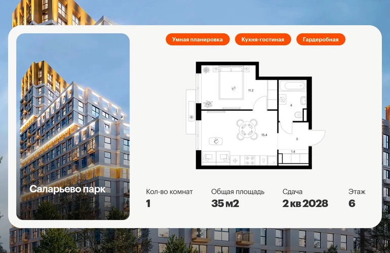 Продаётся 1-комн.квартира площадью 35.00 кв.м на 6 этаже 14 этажного дома (Корпус 57.5, секция 5) проекта ПИК Саларьево парк. Светлый просторный подъезд на уровне земли, функциональная планировка, большие окна, с отделкой. Жилой район «Саларьево парк» расположен в Новой Москве, в четырёх километрах от МКАД по Киевскому шоссе. Две станции метро: «Саларьево» и «Филатов луг», — находятся в пешей доступности от проекта. Дойти до них можно за 5–10 минут. В квартале уже создана качественная среда, где есть абсолютно всё для полноценной жизни, работы и отдыха. «Саларьево парк» — не просто квартал, а полноценный жилой район, который отличается разноплановой архитектурой. Над концепцией квартала работали несколько ведущих архитектурных бюро, которые стремились добиться разнообразия в фасадных решениях. Ярким примером такого подхода станут корпуса 82 и 83, которые относятся к «Серии плюс». Новый корпус 83 был создан по принципам южной архитектуры: расслабленный и лаконичный силуэт зданий, привлекающий к себе внимание. Архитектурная изюминка 83-го корпуса — террасы и фигурные балконы. Вместе с окнами и другими акцентными элементами они создают уникальный облик здания, отсылая нас к изысканной южной архитектуре. Все корпуса в квартале гармонично сочетаются, образуя единую городскую среду. Здесь приятно гулять и проводить время на улице всей семьёй. В «Саларьево парке» создана уникальная образовательная среда, включающая в себя шесть школ, рассчитанных на 6 250 учеников. Четыре из них уже открыты, их посещает 2 300 детей. Также на территории «Саларьево парка» находится 12 детских садов, один из которых с бассейном. Сейчас уже открыты 8 садов. В «Саларьево парке» открыта уникальная игровая площадка — PlayHub «Оригами». Здесь есть ручей, горка-труба и рельефные холмы. Взрослые смогут отдохнуть в уютном кафе, пока дети играют. Также на территории проекта есть SportHub — большая спортивная зона, разделённая по интересам и возрастам. Здесь можно заниматься разными видами спорта: футболом, баскетболом, волейболом и стритболом. Зимой центральную часть площадки превращают в каток. Во дворах-парках жилого квартала есть места для отдыха, детские и спортивные площадки. На первых этажах домов расположены магазины, кафе и полезные сервисы. Также вблизи проекта есть несколько масштабных торговых центров. До ТЦ «Саларис» пять минут пешком, до «Рио», Metro Cash & Carry и «Леруа Мерлен» — пять минут на автомобиле. Артикул - 1018730О застройщике