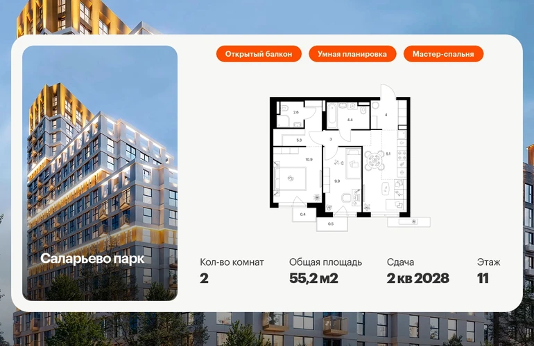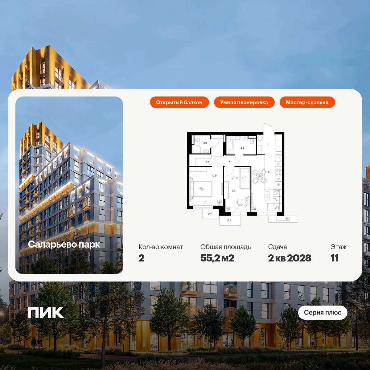 Продаётся 2-комн.квартира площадью 55.20 кв.м на 11 этаже 14 этажного дома (Корпус 57.5, секция 5) проекта ПИК Саларьево парк. Светлый просторный подъезд на уровне земли, функциональная планировка, большие окна, с отделкой. Артикул - 1018794О застройщике
