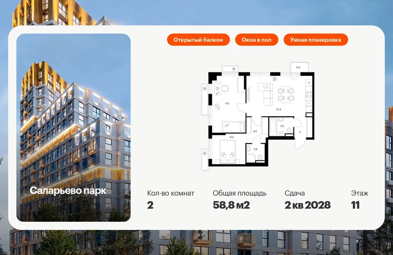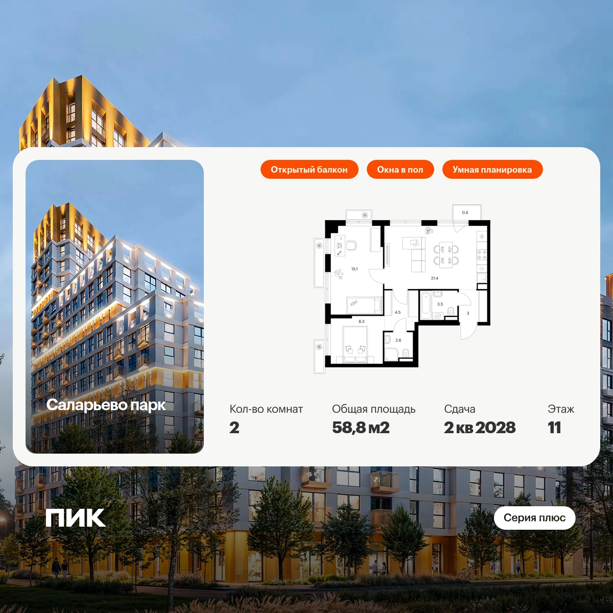 Продаётся 2-комн.квартира площадью 58.80 кв.м на 11 этаже 15 этажного дома (Корпус 57.2, секция 2) проекта ПИК Саларьево парк. Светлый просторный подъезд на уровне земли, функциональная планировка, большие окна, с отделкой. Жилой район «Саларьево парк» расположен в Новой Москве, в четырёх километрах от МКАД по Киевскому шоссе. Две станции метро: «Саларьево» и «Филатов луг», — находятся в пешей доступности от проекта. Дойти до них можно за 5–10 минут. В квартале уже создана качественная среда, где есть абсолютно всё для полноценной жизни, работы и отдыха. «Саларьево парк» — не просто квартал, а полноценный жилой район, который отличается разноплановой архитектурой. Над концепцией квартала работали несколько ведущих архитектурных бюро, которые стремились добиться разнообразия в фасадных решениях. Ярким примером такого подхода станут корпуса 82 и 83, которые относятся к «Серии плюс». Новый корпус 83 был создан по принципам южной архитектуры: расслабленный и лаконичный силуэт зданий, привлекающий к себе внимание. Архитектурная изюминка 83-го корпуса — террасы и фигурные балконы. Вместе с окнами и другими акцентными элементами они создают уникальный облик здания, отсылая нас к изысканной южной архитектуре. Все корпуса в квартале гармонично сочетаются, образуя единую городскую среду. Здесь приятно гулять и проводить время на улице всей семьёй. В «Саларьево парке» создана уникальная образовательная среда, включающая в себя шесть школ, рассчитанных на 6 250 учеников. Четыре из них уже открыты, их посещает 2 300 детей. Также на территории «Саларьево парка» находится 12 детских садов, один из которых с бассейном. Сейчас уже открыты 8 садов. В «Саларьево парке» открыта уникальная игровая площадка — PlayHub «Оригами». Здесь есть ручей, горка-труба и рельефные холмы. Взрослые смогут отдохнуть в уютном кафе, пока дети играют. Также на территории проекта есть SportHub — большая спортивная зона, разделённая по интересам и возрастам. Здесь можно заниматься разными видами спорта: футболом, баскетболом, волейболом и стритболом. Зимой центральную часть площадки превращают в каток. Во дворах-парках жилого квартала есть места для отдыха, детские и спортивные площадки. На первых этажах домов расположены магазины, кафе и полезные сервисы. Также вблизи проекта есть несколько масштабных торговых центров. До ТЦ «Саларис» пять минут пешком, до «Рио», Metro Cash & Carry и «Леруа Мерлен» — пять минут на автомобиле. Артикул - 1019182О застройщике
