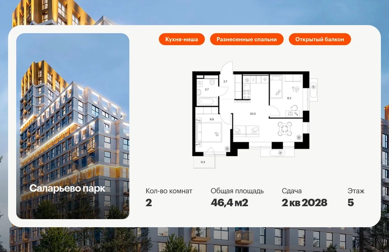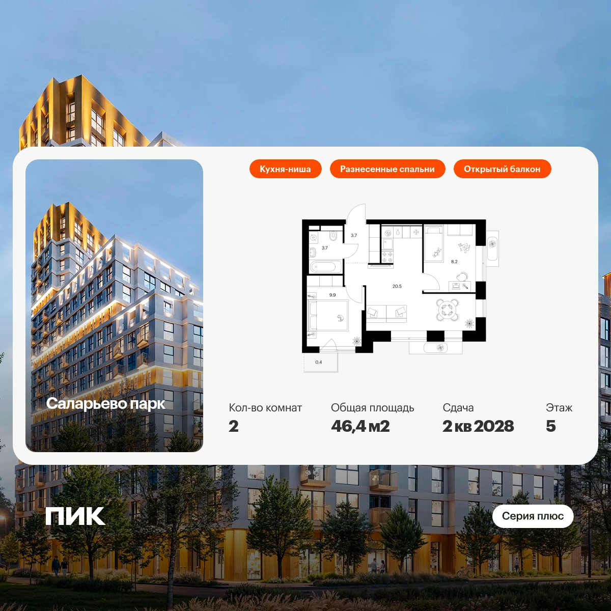 Продаётся 2-комн.квартира площадью 46.40 кв.м на 5 этаже 16 этажного дома (Корпус 57.1, секция 1) проекта ПИК Саларьево парк. Светлый просторный подъезд на уровне земли, функциональная планировка, большие окна, с отделкой. Жилой район «Саларьево парк» расположен в Новой Москве, в четырёх километрах от МКАД по Киевскому шоссе. Две станции метро: «Саларьево» и «Филатов луг», — находятся в пешей доступности от проекта. Дойти до них можно за 5–10 минут. В квартале уже создана качественная среда, где есть абсолютно всё для полноценной жизни, работы и отдыха. «Саларьево парк» — не просто квартал, а полноценный жилой район, который отличается разноплановой архитектурой. Над концепцией квартала работали несколько ведущих архитектурных бюро, которые стремились добиться разнообразия в фасадных решениях. Ярким примером такого подхода станут корпуса 82 и 83, которые относятся к «Серии плюс». Новый корпус 83 был создан по принципам южной архитектуры: расслабленный и лаконичный силуэт зданий, привлекающий к себе внимание. Архитектурная изюминка 83-го корпуса — террасы и фигурные балконы. Вместе с окнами и другими акцентными элементами они создают уникальный облик здания, отсылая нас к изысканной южной архитектуре. Все корпуса в квартале гармонично сочетаются, образуя единую городскую среду. Здесь приятно гулять и проводить время на улице всей семьёй. В «Саларьево парке» создана уникальная образовательная среда, включающая в себя шесть школ, рассчитанных на 6 250 учеников. Четыре из них уже открыты, их посещает 2 300 детей. Также на территории «Саларьево парка» находится 12 детских садов, один из которых с бассейном. Сейчас уже открыты 8 садов. В «Саларьево парке» открыта уникальная игровая площадка — PlayHub «Оригами». Здесь есть ручей, горка-труба и рельефные холмы. Взрослые смогут отдохнуть в уютном кафе, пока дети играют. Также на территории проекта есть SportHub — большая спортивная зона, разделённая по интересам и возрастам. Здесь можно заниматься разными видами спорта: футболом, баскетболом, волейболом и стритболом. Зимой центральную часть площадки превращают в каток. Во дворах-парках жилого квартала есть места для отдыха, детские и спортивные площадки. На первых этажах домов расположены магазины, кафе и полезные сервисы. Также вблизи проекта есть несколько масштабных торговых центров. До ТЦ «Саларис» пять минут пешком, до «Рио», Metro Cash & Carry и «Леруа Мерлен» — пять минут на автомобиле. Артикул - 1019088О застройщике