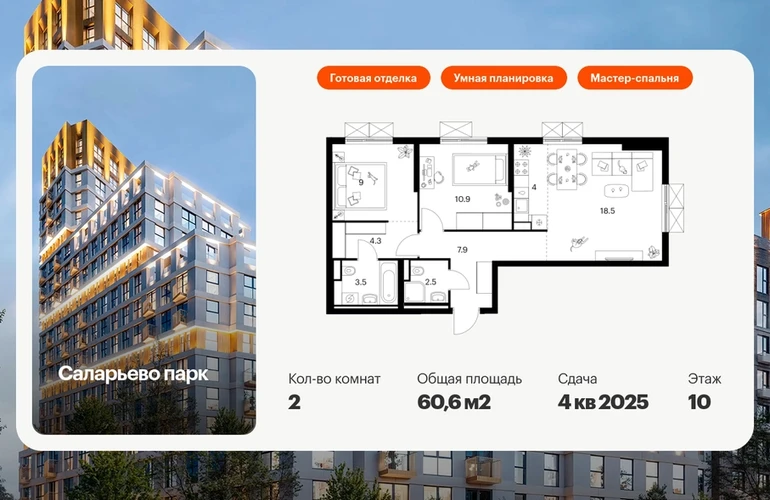 Продаётся 2-комн.квартира площадью 60.60 кв.м на 10 этаже 22 этажного дома (Корпус 56.2 , секция 3) проекта ПИК Саларьево парк. Светлый просторный подъезд на уровне земли, функциональная планировка, большие окна, с отделкой. Жилой район «Саларьево парк» расположен в Новой Москве, в четырёх километрах от МКАД по Киевскому шоссе. Две станции метро: «Саларьево» и «Филатов луг» — находятся в пешей доступности от проекта. Дойти до них можно за 5–10 минут. В квартале уже создана качественная среда, где есть абсолютно всё для полноценной жизни, работы и отдыха. «Саларьево парк» — не просто квартал, а полноценный жилой район, который отличается разноплановой архитектурой. Над концепцией квартала работали несколько ведущих архитектурных бюро, которые стремились добиться разнообразия в фасадных решениях. Ярким примером такого подхода станет корпус 83, который относится к «Серии плюс». Новый корпус 83 был создан по принципам южной архитектуры: расслабленный и лаконичный силуэт зданий, привлекающий к себе внимание. Архитектурная изюминка 83-го корпуса — террасы и фигурные балконы. Вместе с окнами и другими акцентными элементами они создают уникальный облик здания, отсылая нас к изысканной южной архитектуре. Все корпуса в квартале гармонично сочетаются, образуя единую городскую среду. Здесь приятно гулять и проводить время на улице всей семьёй. В «Саларьево парке» создана уникальная образовательная среда, включающая в себя шесть школ, рассчитанных на 6 250 учеников. Две из них уже открыты, их посещает 2 300 детей. Также на территории «Саларьево парка» находится 12 детских садов, один из которых с бассейном. Сейчас уже открыты 7 садов. В «Саларьево парке» открыта уникальная игровая площадка — PlayHub «Оригами». Здесь есть ручей, горка-труба и рельефные холмы. Взрослые смогут отдохнуть в уютном кафе, пока дети играют. Также на территории проекта есть SportHub — большая спортивная зона, разделённая по интересам и возрастам. Здесь можно заниматься разными видами спорта: футболом, баскетболом, волейболом и стритболом. Зимой центральную часть площадки превращают в каток. Во дворах-парках жилого квартала есть места для отдыха, детские и спортивные площадки. На первых этажах домов расположены магазины, кафе и полезные сервисы. Также вблизи проекта есть несколько масштабных торговых центров. До ТЦ «Саларис» пять минут пешком, до «Рио», Metro Cash & Carry и «Лемана про» — пять минут на автомобиле. Артикул - 990446О застройщике