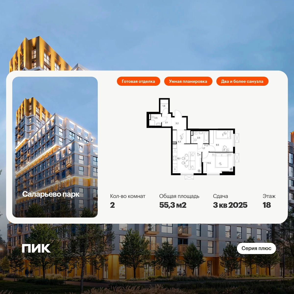 Продаётся 2-комн.квартира площадью 55.30 кв.м на 18 этаже 24 этажного дома (Корпус 68.5, секция 5) проекта ПИК Саларьево парк. Светлый просторный подъезд на уровне земли, функциональная планировка, большие окна, с отделкой. Жилой район «Саларьево парк» расположен в Новой Москве, в четырёх километрах от МКАД по Киевскому шоссе. Две станции метро: «Саларьево» и «Филатов луг» — находятся в пешей доступности от проекта. Дойти до них можно за 5–10 минут. В квартале уже создана качественная среда, где есть абсолютно всё для полноценной жизни, работы и отдыха. «Саларьево парк» — не просто квартал, а полноценный жилой район, который отличается разноплановой архитектурой. Над концепцией квартала работали несколько ведущих архитектурных бюро, которые стремились добиться разнообразия в фасадных решениях. Ярким примером такого подхода станет корпус 83, который относится к «Серии плюс». Новый корпус 83 был создан по принципам южной архитектуры: расслабленный и лаконичный силуэт зданий, привлекающий к себе внимание. Архитектурная изюминка 83-го корпуса — террасы и фигурные балконы. Вместе с окнами и другими акцентными элементами они создают уникальный облик здания, отсылая нас к изысканной южной архитектуре. Все корпуса в квартале гармонично сочетаются, образуя единую городскую среду. Здесь приятно гулять и проводить время на улице всей семьёй. В «Саларьево парке» создана уникальная образовательная среда, включающая в себя шесть школ, рассчитанных на 6 250 учеников. Две из них уже открыты, их посещает 2 300 детей. Также на территории «Саларьево парка» находится 12 детских садов, один из которых с бассейном. Сейчас уже открыты 7 садов. В «Саларьево парке» открыта уникальная игровая площадка — PlayHub «Оригами». Здесь есть ручей, горка-труба и рельефные холмы. Взрослые смогут отдохнуть в уютном кафе, пока дети играют. Также на территории проекта есть SportHub — большая спортивная зона, разделённая по интересам и возрастам. Здесь можно заниматься разными видами спорта: футболом, баскетболом, волейболом и стритболом. Зимой центральную часть площадки превращают в каток. Во дворах-парках жилого квартала есть места для отдыха, детские и спортивные площадки. На первых этажах домов расположены магазины, кафе и полезные сервисы. Также вблизи проекта есть несколько масштабных торговых центров. До ТЦ «Саларис» пять минут пешком, до «Рио», Metro Cash & Carry и «Лемана про» — пять минут на автомобиле. Артикул - 868161О застройщике