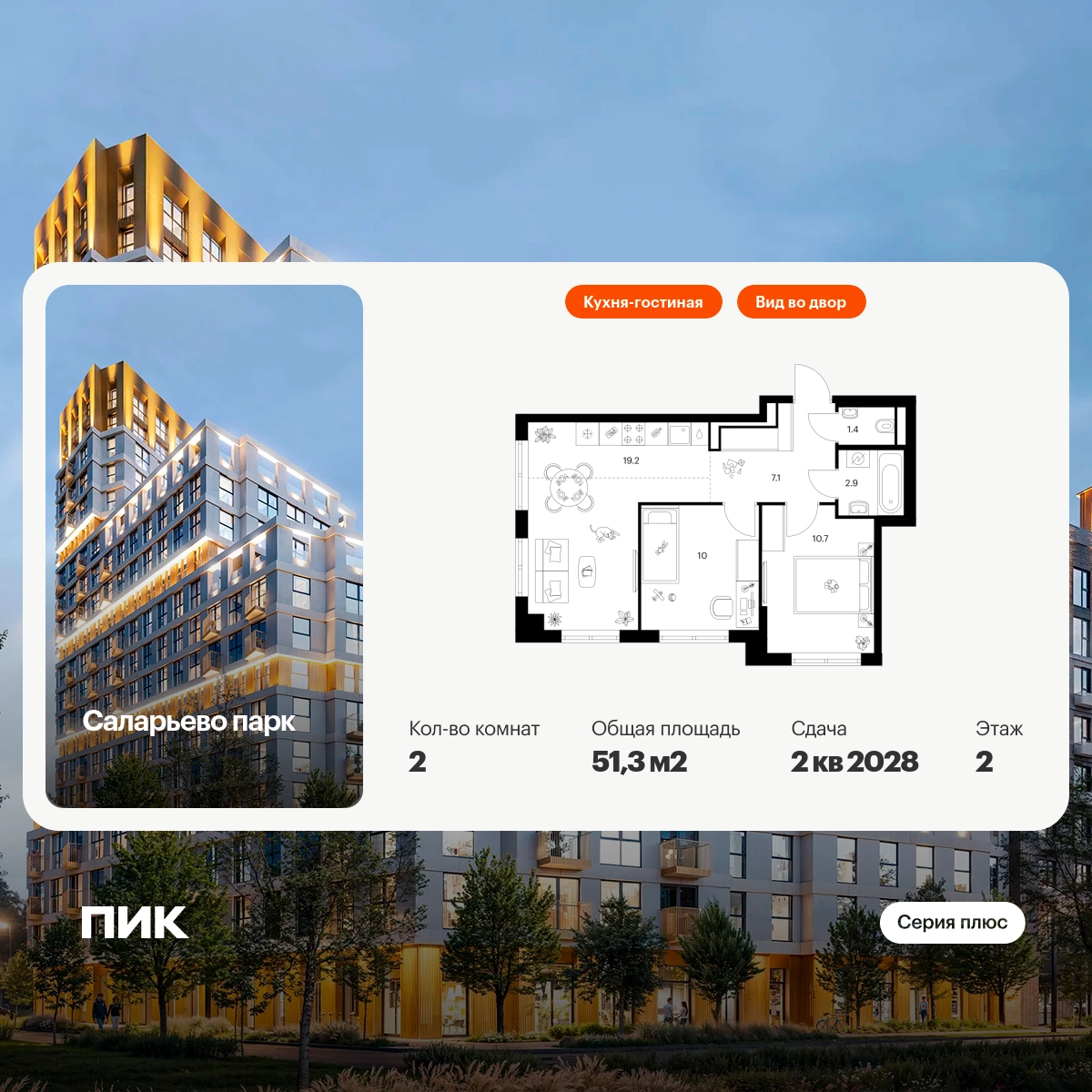 Продаётся 2-комн.квартира площадью 51.30 кв.м на 2 этаже 14 этажного дома (Корпус 57.5, секция 5) проекта ПИК Саларьево парк. Светлый просторный подъезд на уровне земли, функциональная планировка, большие окна, с отделкой. Жилой район «Саларьево парк» расположен в Новой Москве, в четырёх километрах от МКАД по Киевскому шоссе. Две станции метро: «Саларьево» и «Филатов луг» — находятся в пешей доступности от проекта. Дойти до них можно за 5–10 минут. В квартале уже создана качественная среда, где есть абсолютно всё для полноценной жизни, работы и отдыха. «Саларьево парк» — не просто квартал, а полноценный жилой район, который отличается разноплановой архитектурой. Над концепцией квартала работали несколько ведущих архитектурных бюро, которые стремились добиться разнообразия в фасадных решениях. Ярким примером такого подхода станет корпус 83, который относится к «Серии плюс». Новый корпус 83 был создан по принципам южной архитектуры: расслабленный и лаконичный силуэт зданий, привлекающий к себе внимание. Архитектурная изюминка 83-го корпуса — террасы и фигурные балконы. Вместе с окнами и другими акцентными элементами они создают уникальный облик здания, отсылая нас к изысканной южной архитектуре. Все корпуса в квартале гармонично сочетаются, образуя единую городскую среду. Здесь приятно гулять и проводить время на улице всей семьёй. В «Саларьево парке» создана уникальная образовательная среда, включающая в себя шесть школ, рассчитанных на 6 250 учеников. Две из них уже открыты, их посещает 2 300 детей. Также на территории «Саларьево парка» находится 12 детских садов, один из которых с бассейном. Сейчас уже открыты 7 садов. В «Саларьево парке» открыта уникальная игровая площадка — PlayHub «Оригами». Здесь есть ручей, горка-труба и рельефные холмы. Взрослые смогут отдохнуть в уютном кафе, пока дети играют. Также на территории проекта есть SportHub — большая спортивная зона, разделённая по интересам и возрастам. Здесь можно заниматься разными видами спорта: футболом, баскетболом, волейболом и стритболом. Зимой центральную часть площадки превращают в каток. Во дворах-парках жилого квартала есть места для отдыха, детские и спортивные площадки. На первых этажах домов расположены магазины, кафе и полезные сервисы. Также вблизи проекта есть несколько масштабных торговых центров. До ТЦ «Саларис» пять минут пешком, до «Рио», Metro Cash & Carry и «Лемана про» — пять минут на автомобиле. Артикул - 1018679О застройщике