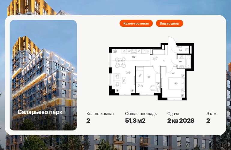 Продаётся 2-комн.квартира площадью 51.30 кв.м на 2 этаже 14 этажного дома (Корпус 57.5, секция 5) проекта ПИК Саларьево парк. Светлый просторный подъезд на уровне земли, функциональная планировка, большие окна, с отделкой. Жилой район «Саларьево парк» расположен в Новой Москве, в четырёх километрах от МКАД по Киевскому шоссе. Две станции метро: «Саларьево» и «Филатов луг» — находятся в пешей доступности от проекта. Дойти до них можно за 5–10 минут. В квартале уже создана качественная среда, где есть абсолютно всё для полноценной жизни, работы и отдыха. «Саларьево парк» — не просто квартал, а полноценный жилой район, который отличается разноплановой архитектурой. Над концепцией квартала работали несколько ведущих архитектурных бюро, которые стремились добиться разнообразия в фасадных решениях. Ярким примером такого подхода станет корпус 83, который относится к «Серии плюс». Новый корпус 83 был создан по принципам южной архитектуры: расслабленный и лаконичный силуэт зданий, привлекающий к себе внимание. Архитектурная изюминка 83-го корпуса — террасы и фигурные балконы. Вместе с окнами и другими акцентными элементами они создают уникальный облик здания, отсылая нас к изысканной южной архитектуре. Все корпуса в квартале гармонично сочетаются, образуя единую городскую среду. Здесь приятно гулять и проводить время на улице всей семьёй. В «Саларьево парке» создана уникальная образовательная среда, включающая в себя шесть школ, рассчитанных на 6 250 учеников. Две из них уже открыты, их посещает 2 300 детей. Также на территории «Саларьево парка» находится 12 детских садов, один из которых с бассейном. Сейчас уже открыты 7 садов. В «Саларьево парке» открыта уникальная игровая площадка — PlayHub «Оригами». Здесь есть ручей, горка-труба и рельефные холмы. Взрослые смогут отдохнуть в уютном кафе, пока дети играют. Также на территории проекта есть SportHub — большая спортивная зона, разделённая по интересам и возрастам. Здесь можно заниматься разными видами спорта: футболом, баскетболом, волейболом и стритболом. Зимой центральную часть площадки превращают в каток. Во дворах-парках жилого квартала есть места для отдыха, детские и спортивные площадки. На первых этажах домов расположены магазины, кафе и полезные сервисы. Также вблизи проекта есть несколько масштабных торговых центров. До ТЦ «Саларис» пять минут пешком, до «Рио», Metro Cash & Carry и «Лемана про» — пять минут на автомобиле. Артикул - 1018679О застройщике