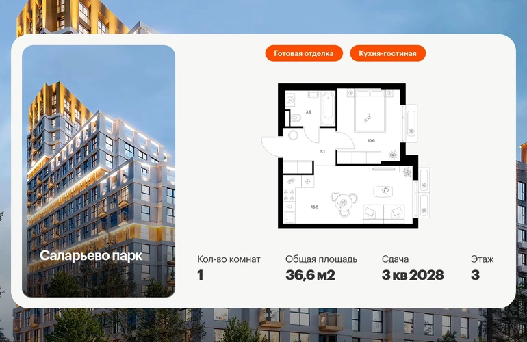 Продаётся 1-комн.квартира площадью 36.60 кв.м на 3 этаже 14 этажного дома (Корпус 69.7, секция 7) проекта ПИК Саларьево парк. Светлый просторный подъезд на уровне земли, функциональная планировка, большие окна, с отделкой. Жилой район «Саларьево парк» расположен в Новой Москве, в четырёх километрах от МКАД по Киевскому шоссе. Две станции метро: «Саларьево» и «Филатов луг» — находятся в пешей доступности от проекта. Дойти до них можно за 5–10 минут. В квартале уже создана качественная среда, где есть абсолютно всё для полноценной жизни, работы и отдыха. «Саларьево парк» — не просто квартал, а полноценный жилой район, который отличается разноплановой архитектурой. Над концепцией квартала работали несколько ведущих архитектурных бюро, которые стремились добиться разнообразия в фасадных решениях. Ярким примером такого подхода станет корпус 83, который относится к «Серии плюс». Новый корпус 83 был создан по принципам южной архитектуры: расслабленный и лаконичный силуэт зданий, привлекающий к себе внимание. Архитектурная изюминка 83-го корпуса — террасы и фигурные балконы. Вместе с окнами и другими акцентными элементами они создают уникальный облик здания, отсылая нас к изысканной южной архитектуре. Все корпуса в квартале гармонично сочетаются, образуя единую городскую среду. Здесь приятно гулять и проводить время на улице всей семьёй. В «Саларьево парке» создана уникальная образовательная среда, включающая в себя шесть школ, рассчитанных на 6 250 учеников. Две из них уже открыты, их посещает 2 300 детей. Также на территории «Саларьево парка» находится 12 детских садов, один из которых с бассейном. Сейчас уже открыты 7 садов. В «Саларьево парке» открыта уникальная игровая площадка — PlayHub «Оригами». Здесь есть ручей, горка-труба и рельефные холмы. Взрослые смогут отдохнуть в уютном кафе, пока дети играют. Также на территории проекта есть SportHub — большая спортивная зона, разделённая по интересам и возрастам. Здесь можно заниматься разными видами спорта: футболом, баскетболом, волейболом и стритболом. Зимой центральную часть площадки превращают в каток. Во дворах-парках жилого квартала есть места для отдыха, детские и спортивные площадки. На первых этажах домов расположены магазины, кафе и полезные сервисы. Также вблизи проекта есть несколько масштабных торговых центров. До ТЦ «Саларис» пять минут пешком, до «Рио», Metro Cash & Carry и «Лемана про» — пять минут на автомобиле. Артикул - 1024107О застройщике