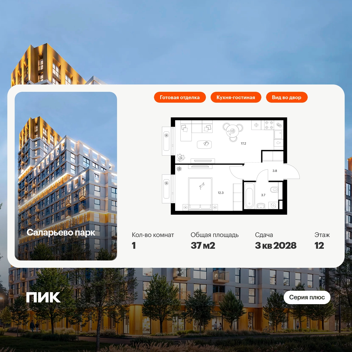 Продаётся 1-комн.квартира площадью 37.00 кв.м на 12 этаже 14 этажного дома (Корпус 69.7, секция 7) проекта ПИК Саларьево парк. Светлый просторный подъезд на уровне земли, функциональная планировка, большие окна, с отделкой. Жилой район «Саларьево парк» расположен в Новой Москве, в четырёх километрах от МКАД по Киевскому шоссе. Две станции метро: «Саларьево» и «Филатов луг» — находятся в пешей доступности от проекта. Дойти до них можно за 5–10 минут. В квартале уже создана качественная среда, где есть абсолютно всё для полноценной жизни, работы и отдыха. «Саларьево парк» — не просто квартал, а полноценный жилой район, который отличается разноплановой архитектурой. Над концепцией квартала работали несколько ведущих архитектурных бюро, которые стремились добиться разнообразия в фасадных решениях. Ярким примером такого подхода станет корпус 83, который относится к «Серии плюс». Новый корпус 83 был создан по принципам южной архитектуры: расслабленный и лаконичный силуэт зданий, привлекающий к себе внимание. Архитектурная изюминка 83-го корпуса — террасы и фигурные балконы. Вместе с окнами и другими акцентными элементами они создают уникальный облик здания, отсылая нас к изысканной южной архитектуре. Все корпуса в квартале гармонично сочетаются, образуя единую городскую среду. Здесь приятно гулять и проводить время на улице всей семьёй. В «Саларьево парке» создана уникальная образовательная среда, включающая в себя шесть школ, рассчитанных на 6 250 учеников. Две из них уже открыты, их посещает 2 300 детей. Также на территории «Саларьево парка» находится 12 детских садов, один из которых с бассейном. Сейчас уже открыты 7 садов. В «Саларьево парке» открыта уникальная игровая площадка — PlayHub «Оригами». Здесь есть ручей, горка-труба и рельефные холмы. Взрослые смогут отдохнуть в уютном кафе, пока дети играют. Также на территории проекта есть SportHub — большая спортивная зона, разделённая по интересам и возрастам. Здесь можно заниматься разными видами спорта: футболом, баскетболом, волейболом и стритболом. Зимой центральную часть площадки превращают в каток. Во дворах-парках жилого квартала есть места для отдыха, детские и спортивные площадки. На первых этажах домов расположены магазины, кафе и полезные сервисы. Также вблизи проекта есть несколько масштабных торговых центров. До ТЦ «Саларис» пять минут пешком, до «Рио», Metro Cash & Carry и «Лемана про» — пять минут на автомобиле. Артикул - 1024223О застройщике