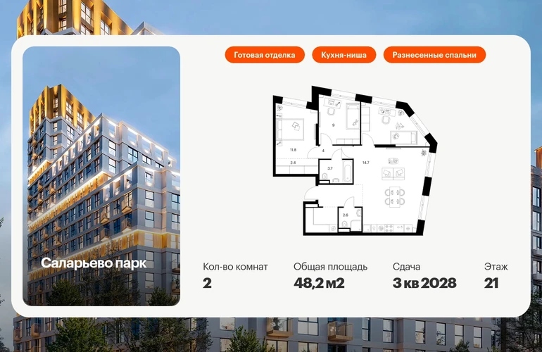 Продаётся 2-комн.квартира площадью 48.20 кв.м на 21 этаже 22 этажного дома (Корпус 73, секция 1) проекта ПИК Саларьево парк. Светлый просторный подъезд на уровне земли, функциональная планировка, большие окна, с отделкой. Жилой район «Саларьево парк» расположен в Новой Москве, в четырёх километрах от МКАД по Киевскому шоссе. Две станции метро: «Саларьево» и «Филатов луг» — находятся в пешей доступности от проекта. Дойти до них можно за 5–10 минут. В квартале уже создана качественная среда, где есть абсолютно всё для полноценной жизни, работы и отдыха. «Саларьево парк» — не просто квартал, а полноценный жилой район, который отличается разноплановой архитектурой. Над концепцией квартала работали несколько ведущих архитектурных бюро, которые стремились добиться разнообразия в фасадных решениях. Ярким примером такого подхода станет корпус 83, который относится к «Серии плюс». Новый корпус 83 был создан по принципам южной архитектуры: расслабленный и лаконичный силуэт зданий, привлекающий к себе внимание. Архитектурная изюминка 83-го корпуса — террасы и фигурные балконы. Вместе с окнами и другими акцентными элементами они создают уникальный облик здания, отсылая нас к изысканной южной архитектуре. Все корпуса в квартале гармонично сочетаются, образуя единую городскую среду. Здесь приятно гулять и проводить время на улице всей семьёй. В «Саларьево парке» создана уникальная образовательная среда, включающая в себя шесть школ, рассчитанных на 6 250 учеников. Две из них уже открыты, их посещает 2 300 детей. Также на территории «Саларьево парка» находится 12 детских садов, один из которых с бассейном. Сейчас уже открыты 7 садов. В «Саларьево парке» открыта уникальная игровая площадка — PlayHub «Оригами». Здесь есть ручей, горка-труба и рельефные холмы. Взрослые смогут отдохнуть в уютном кафе, пока дети играют. Также на территории проекта есть SportHub — большая спортивная зона, разделённая по интересам и возрастам. Здесь можно заниматься разными видами спорта: футболом, баскетболом, волейболом и стритболом. Зимой центральную часть площадки превращают в каток. Во дворах-парках жилого квартала есть места для отдыха, детские и спортивные площадки. На первых этажах домов расположены магазины, кафе и полезные сервисы. Также вблизи проекта есть несколько масштабных торговых центров. До ТЦ «Саларис» пять минут пешком, до «Рио», Metro Cash & Carry и «Лемана про» — пять минут на автомобиле. Артикул - 1016584О застройщике