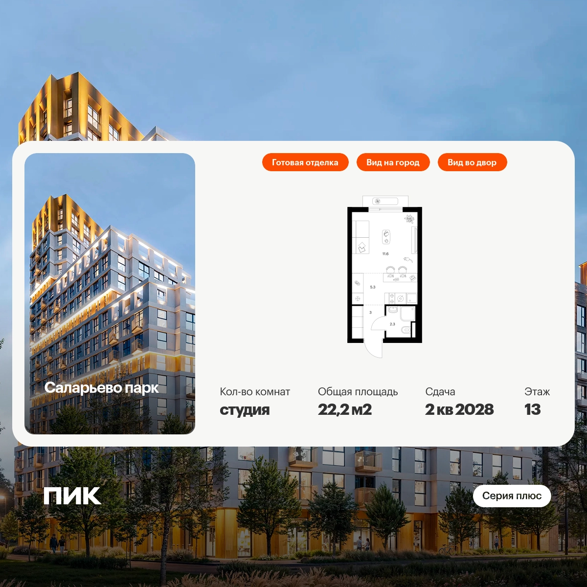 Продаётся квартира-студия площадью 22.20 кв.м на 13 этаже 18 этажного дома (Корпус 74.1, секция 1) проекта ПИК Саларьево парк. Светлый просторный подъезд на уровне земли, функциональная планировка, большие окна, с отделкой. Жилой район «Саларьево парк» расположен в Новой Москве, в четырёх километрах от МКАД по Киевскому шоссе. Две станции метро: «Саларьево» и «Филатов луг» — находятся в пешей доступности от проекта. Дойти до них можно за 5–10 минут. В квартале уже создана качественная среда, где есть абсолютно всё для полноценной жизни, работы и отдыха. «Саларьево парк» — не просто квартал, а полноценный жилой район, который отличается разноплановой архитектурой. Над концепцией квартала работали несколько ведущих архитектурных бюро, которые стремились добиться разнообразия в фасадных решениях. Ярким примером такого подхода станет корпус 83, который относится к «Серии плюс». Новый корпус 83 был создан по принципам южной архитектуры: расслабленный и лаконичный силуэт зданий, привлекающий к себе внимание. Архитектурная изюминка 83-го корпуса — террасы и фигурные балконы. Вместе с окнами и другими акцентными элементами они создают уникальный облик здания, отсылая нас к изысканной южной архитектуре. Все корпуса в квартале гармонично сочетаются, образуя единую городскую среду. Здесь приятно гулять и проводить время на улице всей семьёй. В «Саларьево парке» создана уникальная образовательная среда, включающая в себя шесть школ, рассчитанных на 6 250 учеников. Две из них уже открыты, их посещает 2 300 детей. Также на территории «Саларьево парка» находится 12 детских садов, один из которых с бассейном. Сейчас уже открыты 7 садов. В «Саларьево парке» открыта уникальная игровая площадка — PlayHub «Оригами». Здесь есть ручей, горка-труба и рельефные холмы. Взрослые смогут отдохнуть в уютном кафе, пока дети играют. Также на территории проекта есть SportHub — большая спортивная зона, разделённая по интересам и возрастам. Здесь можно заниматься разными видами спорта: футболом, баскетболом, волейболом и стритболом. Зимой центральную часть площадки превращают в каток. Во дворах-парках жилого квартала есть места для отдыха, детские и спортивные площадки. На первых этажах домов расположены магазины, кафе и полезные сервисы. Также вблизи проекта есть несколько масштабных торговых центров. До ТЦ «Саларис» пять минут пешком, до «Рио», Metro Cash & Carry и «Лемана про» — пять минут на автомобиле. Артикул - 1006195О застройщике