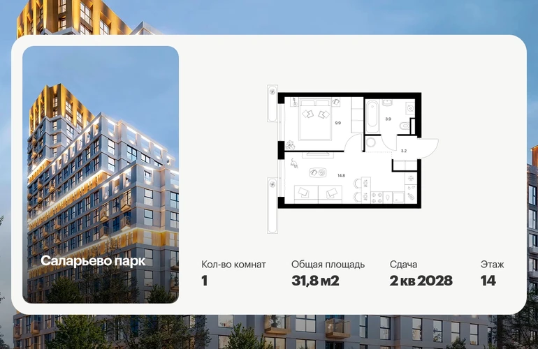 Продаётся 1-комн.квартира площадью 31.80 кв.м на 14 этаже 16 этажного дома (Корпус 57.4, секция 4) проекта ПИК Саларьево парк. Светлый просторный подъезд на уровне земли, функциональная планировка, большие окна, с отделкой. Жилой район «Саларьево парк» расположен в Новой Москве, в четырёх километрах от МКАД по Киевскому шоссе. Две станции метро: «Саларьево» и «Филатов луг» — находятся в пешей доступности от проекта. Дойти до них можно за 5–10 минут. В квартале уже создана качественная среда, где есть абсолютно всё для полноценной жизни, работы и отдыха. «Саларьево парк» — не просто квартал, а полноценный жилой район, который отличается разноплановой архитектурой. Над концепцией квартала работали несколько ведущих архитектурных бюро, которые стремились добиться разнообразия в фасадных решениях. Ярким примером такого подхода станет корпус 83, который относится к «Серии плюс». Новый корпус 83 был создан по принципам южной архитектуры: расслабленный и лаконичный силуэт зданий, привлекающий к себе внимание. Архитектурная изюминка 83-го корпуса — террасы и фигурные балконы. Вместе с окнами и другими акцентными элементами они создают уникальный облик здания, отсылая нас к изысканной южной архитектуре. Все корпуса в квартале гармонично сочетаются, образуя единую городскую среду. Здесь приятно гулять и проводить время на улице всей семьёй. В «Саларьево парке» создана уникальная образовательная среда, включающая в себя шесть школ, рассчитанных на 6 250 учеников. Две из них уже открыты, их посещает 2 300 детей. Также на территории «Саларьево парка» находится 12 детских садов, один из которых с бассейном. Сейчас уже открыты 7 садов. В «Саларьево парке» открыта уникальная игровая площадка — PlayHub «Оригами». Здесь есть ручей, горка-труба и рельефные холмы. Взрослые смогут отдохнуть в уютном кафе, пока дети играют. Также на территории проекта есть SportHub — большая спортивная зона, разделённая по интересам и возрастам. Здесь можно заниматься разными видами спорта: футболом, баскетболом, волейболом и стритболом. Зимой центральную часть площадки превращают в каток. Во дворах-парках жилого квартала есть места для отдыха, детские и спортивные площадки. На первых этажах домов расположены магазины, кафе и полезные сервисы. Также вблизи проекта есть несколько масштабных торговых центров. До ТЦ «Саларис» пять минут пешком, до «Рио», Metro Cash & Carry и «Лемана про» — пять минут на автомобиле. Артикул - 1018663О застройщике