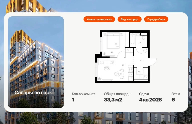Продаётся 1-комн.квартира площадью 33.30 кв.м на 6 этаже 24 этажного дома (Корпус 82.4, секция 4) проекта ПИК Саларьево парк. Светлый просторный подъезд на уровне земли, функциональная планировка, большие окна, с отделкой. Жилой район «Саларьево парк» расположен в Новой Москве, в четырёх километрах от МКАД по Киевскому шоссе. Две станции метро: «Саларьево» и «Филатов луг», — находятся в пешей доступности от проекта. Дойти до них можно за 5–10 минут. В квартале уже создана качественная среда, где есть абсолютно всё для полноценной жизни, работы и отдыха. «Саларьево парк» — не просто квартал, а полноценный жилой район, который отличается разноплановой архитектурой. Над концепцией квартала работали несколько ведущих архитектурных бюро, которые стремились добиться разнообразия в фасадных решениях. Ярким примером такого подхода станут корпуса 82 и 83, которые относятся к «Серии плюс». Новый корпус 83 был создан по принципам южной архитектуры: расслабленный и лаконичный силуэт зданий, привлекающий к себе внимание. Архитектурная изюминка 83-го корпуса — террасы и фигурные балконы. Вместе с окнами и другими акцентными элементами они создают уникальный облик здания, отсылая нас к изысканной южной архитектуре. Все корпуса в квартале гармонично сочетаются, образуя единую городскую среду. Здесь приятно гулять и проводить время на улице всей семьёй. В «Саларьево парке» создана уникальная образовательная среда, включающая в себя шесть школ, рассчитанных на 6 250 учеников. Четыре из них уже открыты, их посещает 2 300 детей. Также на территории «Саларьево парка» находится 12 детских садов, один из которых с бассейном. Сейчас уже открыты 8 садов. В «Саларьево парке» открыта уникальная игровая площадка — PlayHub «Оригами». Здесь есть ручей, горка-труба и рельефные холмы. Взрослые смогут отдохнуть в уютном кафе, пока дети играют. Также на территории проекта есть SportHub — большая спортивная зона, разделённая по интересам и возрастам. Здесь можно заниматься разными видами спорта: футболом, баскетболом, волейболом и стритболом. Зимой центральную часть площадки превращают в каток. Во дворах-парках жилого квартала есть места для отдыха, детские и спортивные площадки. На первых этажах домов расположены магазины, кафе и полезные сервисы. Также вблизи проекта есть несколько масштабных торговых центров. До ТЦ «Саларис» пять минут пешком, до «Рио», Metro Cash & Carry и «Леруа Мерлен» — пять минут на автомобиле. Артикул - 1032567О застройщике