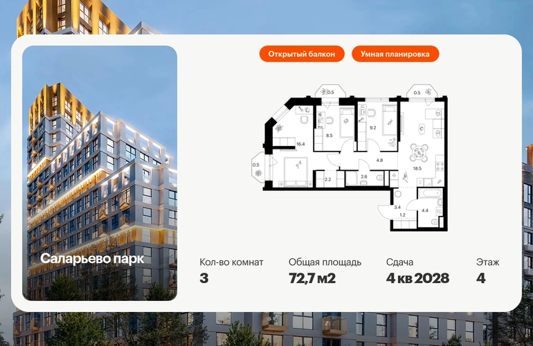 Продаётся 3-комн.квартира площадью 72.70 кв.м на 4 этаже 24 этажного дома (Корпус 82.4, секция 4) проекта ПИК Саларьево парк. Светлый просторный подъезд на уровне земли, функциональная планировка, большие окна, с отделкой. Жилой район «Саларьево парк» расположен в Новой Москве, в четырёх километрах от МКАД по Киевскому шоссе. Две станции метро: «Саларьево» и «Филатов луг», — находятся в пешей доступности от проекта. Дойти до них можно за 5–10 минут. В квартале уже создана качественная среда, где есть абсолютно всё для полноценной жизни, работы и отдыха. «Саларьево парк» — не просто квартал, а полноценный жилой район, который отличается разноплановой архитектурой. Над концепцией квартала работали несколько ведущих архитектурных бюро, которые стремились добиться разнообразия в фасадных решениях. Ярким примером такого подхода станут корпуса 82 и 83, которые относятся к «Серии плюс». Новый корпус 83 был создан по принципам южной архитектуры: расслабленный и лаконичный силуэт зданий, привлекающий к себе внимание. Архитектурная изюминка 83-го корпуса — террасы и фигурные балконы. Вместе с окнами и другими акцентными элементами они создают уникальный облик здания, отсылая нас к изысканной южной архитектуре. Все корпуса в квартале гармонично сочетаются, образуя единую городскую среду. Здесь приятно гулять и проводить время на улице всей семьёй. В «Саларьево парке» создана уникальная образовательная среда, включающая в себя шесть школ, рассчитанных на 6 250 учеников. Четыре из них уже открыты, их посещает 2 300 детей. Также на территории «Саларьево парка» находится 12 детских садов, один из которых с бассейном. Сейчас уже открыты 8 садов. В «Саларьево парке» открыта уникальная игровая площадка — PlayHub «Оригами». Здесь есть ручей, горка-труба и рельефные холмы. Взрослые смогут отдохнуть в уютном кафе, пока дети играют. Также на территории проекта есть SportHub — большая спортивная зона, разделённая по интересам и возрастам. Здесь можно заниматься разными видами спорта: футболом, баскетболом, волейболом и стритболом. Зимой центральную часть площадки превращают в каток. Во дворах-парках жилого квартала есть места для отдыха, детские и спортивные площадки. На первых этажах домов расположены магазины, кафе и полезные сервисы. Также вблизи проекта есть несколько масштабных торговых центров. До ТЦ «Саларис» пять минут пешком, до «Рио», Metro Cash & Carry и «Леруа Мерлен» — пять минут на автомобиле. Артикул - 1032543О застройщике