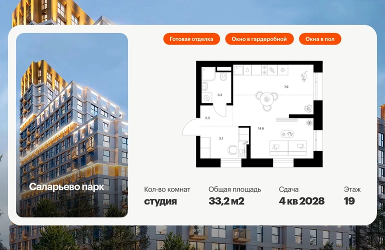 Продаётся квартира-студия площадью 33.20 кв.м на 19 этаже 24 этажного дома (Корпус 82.7, секция 7) проекта ПИК Саларьево парк. Светлый просторный подъезд на уровне земли, функциональная планировка, большие окна, с отделкой. Артикул - 1033086О застройщике