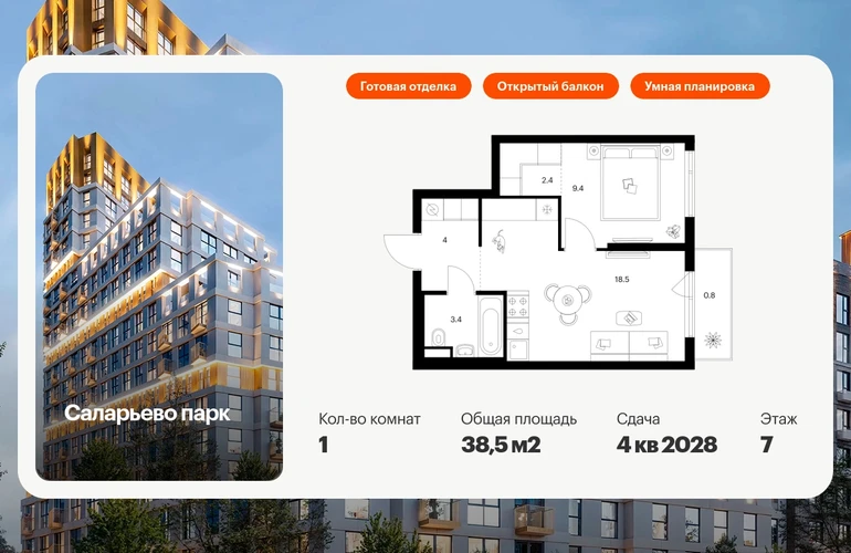 Продаётся 1-комн.квартира площадью 38.50 кв.м на 7 этаже 24 этажного дома (Корпус 82.7, секция 7) проекта ПИК Саларьево парк. Светлый просторный подъезд на уровне земли, функциональная планировка, большие окна, с отделкой. Артикул - 1032962О застройщике