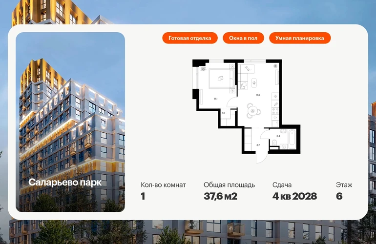 Продаётся 1-комн.квартира площадью 37.60 кв.м на 6 этаже 24 этажного дома (Корпус 82.7, секция 7) проекта ПИК Саларьево парк. Светлый просторный подъезд на уровне земли, функциональная планировка, большие окна, с отделкой. Артикул - 1032971О застройщике