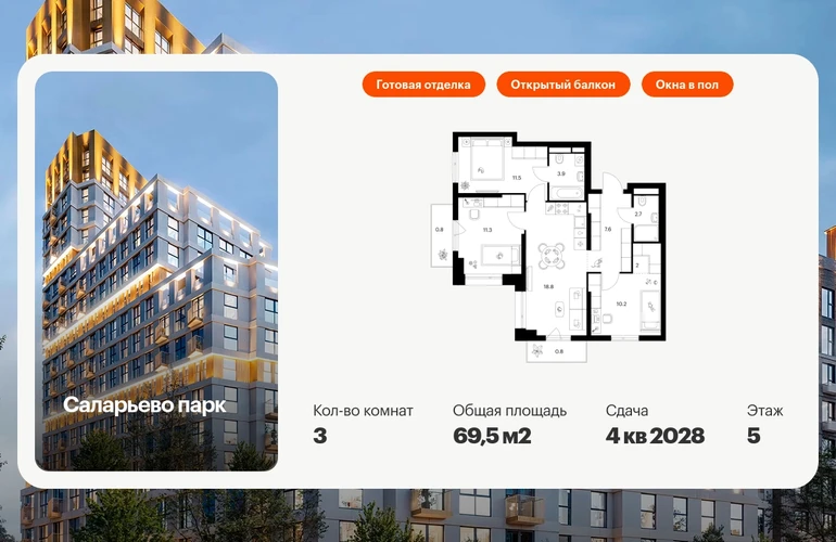 Продаётся 3-комн.квартира площадью 69.50 кв.м на 5 этаже 24 этажного дома (Корпус 82.7, секция 7) проекта ПИК Саларьево парк. Светлый просторный подъезд на уровне земли, функциональная планировка, большие окна, с отделкой. Жилой район «Саларьево парк» расположен в Новой Москве, в четырёх километрах от МКАД по Киевскому шоссе. Две станции метро: «Саларьево» и «Филатов луг», — находятся в пешей доступности от проекта. Дойти до них можно за 5–10 минут. В квартале уже создана качественная среда, где есть абсолютно всё для полноценной жизни, работы и отдыха. «Саларьево парк» — не просто квартал, а полноценный жилой район, который отличается разноплановой архитектурой. Над концепцией квартала работали несколько ведущих архитектурных бюро, которые стремились добиться разнообразия в фасадных решениях. Ярким примером такого подхода станут корпуса 82 и 83, которые относятся к «Серии плюс». Новый корпус 83 был создан по принципам южной архитектуры: расслабленный и лаконичный силуэт зданий, привлекающий к себе внимание. Архитектурная изюминка 83-го корпуса — террасы и фигурные балконы. Вместе с окнами и другими акцентными элементами они создают уникальный облик здания, отсылая нас к изысканной южной архитектуре. Все корпуса в квартале гармонично сочетаются, образуя единую городскую среду. Здесь приятно гулять и проводить время на улице всей семьёй. В «Саларьево парке» создана уникальная образовательная среда, включающая в себя шесть школ, рассчитанных на 6 250 учеников. Четыре из них уже открыты, их посещает 2 300 детей. Также на территории «Саларьево парка» находится 12 детских садов, один из которых с бассейном. Сейчас уже открыты 8 садов. В «Саларьево парке» открыта уникальная игровая площадка — PlayHub «Оригами». Здесь есть ручей, горка-труба и рельефные холмы. Взрослые смогут отдохнуть в уютном кафе, пока дети играют. Также на территории проекта есть SportHub — большая спортивная зона, разделённая по интересам и возрастам. Здесь можно заниматься разными видами спорта: футболом, баскетболом, волейболом и стритболом. Зимой центральную часть площадки превращают в каток. Во дворах-парках жилого квартала есть места для отдыха, детские и спортивные площадки. На первых этажах домов расположены магазины, кафе и полезные сервисы. Также вблизи проекта есть несколько масштабных торговых центров. До ТЦ «Саларис» пять минут пешком, до «Рио», Metro Cash & Carry и «Леруа Мерлен» — пять минут на автомобиле. Артикул - 1032948О застройщике