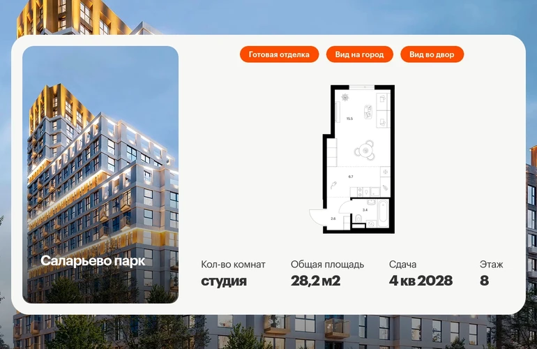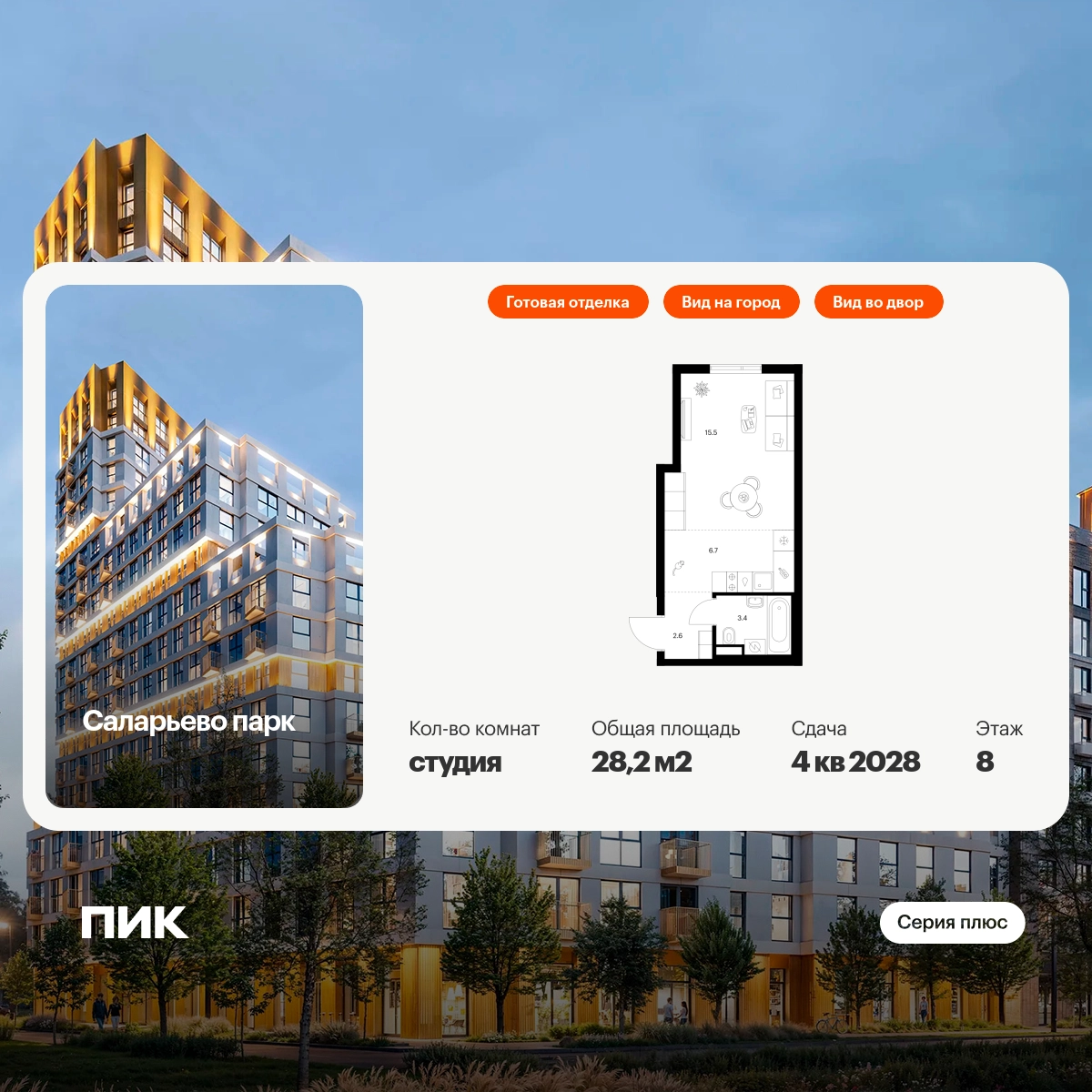 Продаётся квартира-студия площадью 28.20 кв.м на 8 этаже 24 этажного дома (Корпус 82.7, секция 7) проекта ПИК Саларьево парк. Светлый просторный подъезд на уровне земли, функциональная планировка, большие окна, с отделкой. Жилой район «Саларьево парк» расположен в Новой Москве, в четырёх километрах от МКАД по Киевскому шоссе. Две станции метро: «Саларьево» и «Филатов луг», — находятся в пешей доступности от проекта. Дойти до них можно за 5–10 минут. В квартале уже создана качественная среда, где есть абсолютно всё для полноценной жизни, работы и отдыха. «Саларьево парк» — не просто квартал, а полноценный жилой район, который отличается разноплановой архитектурой. Над концепцией квартала работали несколько ведущих архитектурных бюро, которые стремились добиться разнообразия в фасадных решениях. Ярким примером такого подхода станут корпуса 82 и 83, которые относятся к «Серии плюс». Новый корпус 83 был создан по принципам южной архитектуры: расслабленный и лаконичный силуэт зданий, привлекающий к себе внимание. Архитектурная изюминка 83-го корпуса — террасы и фигурные балконы. Вместе с окнами и другими акцентными элементами они создают уникальный облик здания, отсылая нас к изысканной южной архитектуре. Все корпуса в квартале гармонично сочетаются, образуя единую городскую среду. Здесь приятно гулять и проводить время на улице всей семьёй. В «Саларьево парке» создана уникальная образовательная среда, включающая в себя шесть школ, рассчитанных на 6 250 учеников. Четыре из них уже открыты, их посещает 2 300 детей. Также на территории «Саларьево парка» находится 12 детских садов, один из которых с бассейном. Сейчас уже открыты 8 садов. В «Саларьево парке» открыта уникальная игровая площадка — PlayHub «Оригами». Здесь есть ручей, горка-труба и рельефные холмы. Взрослые смогут отдохнуть в уютном кафе, пока дети играют. Также на территории проекта есть SportHub — большая спортивная зона, разделённая по интересам и возрастам. Здесь можно заниматься разными видами спорта: футболом, баскетболом, волейболом и стритболом. Зимой центральную часть площадки превращают в каток. Во дворах-парках жилого квартала есть места для отдыха, детские и спортивные площадки. На первых этажах домов расположены магазины, кафе и полезные сервисы. Также вблизи проекта есть несколько масштабных торговых центров. До ТЦ «Саларис» пять минут пешком, до «Рио», Metro Cash & Carry и «Леруа Мерлен» — пять минут на автомобиле. Артикул - 1032980О застройщике