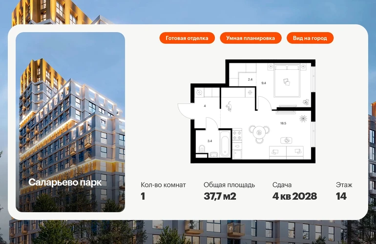 Продаётся 1-комн.квартира площадью 37.70 кв.м на 14 этаже 24 этажного дома (Корпус 82.7, секция 7) проекта ПИК Саларьево парк. Светлый просторный подъезд на уровне земли, функциональная планировка, большие окна, с отделкой. Жилой район «Саларьево парк» расположен в Новой Москве, в четырёх километрах от МКАД по Киевскому шоссе. Две станции метро: «Саларьево» и «Филатов луг», — находятся в пешей доступности от проекта. Дойти до них можно за 5–10 минут. В квартале уже создана качественная среда, где есть абсолютно всё для полноценной жизни, работы и отдыха. «Саларьево парк» — не просто квартал, а полноценный жилой район, который отличается разноплановой архитектурой. Над концепцией квартала работали несколько ведущих архитектурных бюро, которые стремились добиться разнообразия в фасадных решениях. Ярким примером такого подхода станут корпуса 82 и 83, которые относятся к «Серии плюс». Новый корпус 83 был создан по принципам южной архитектуры: расслабленный и лаконичный силуэт зданий, привлекающий к себе внимание. Архитектурная изюминка 83-го корпуса — террасы и фигурные балконы. Вместе с окнами и другими акцентными элементами они создают уникальный облик здания, отсылая нас к изысканной южной архитектуре. Все корпуса в квартале гармонично сочетаются, образуя единую городскую среду. Здесь приятно гулять и проводить время на улице всей семьёй. В «Саларьево парке» создана уникальная образовательная среда, включающая в себя шесть школ, рассчитанных на 6 250 учеников. Четыре из них уже открыты, их посещает 2 300 детей. Также на территории «Саларьево парка» находится 12 детских садов, один из которых с бассейном. Сейчас уже открыты 8 садов. В «Саларьево парке» открыта уникальная игровая площадка — PlayHub «Оригами». Здесь есть ручей, горка-труба и рельефные холмы. Взрослые смогут отдохнуть в уютном кафе, пока дети играют. Также на территории проекта есть SportHub — большая спортивная зона, разделённая по интересам и возрастам. Здесь можно заниматься разными видами спорта: футболом, баскетболом, волейболом и стритболом. Зимой центральную часть площадки превращают в каток. Во дворах-парках жилого квартала есть места для отдыха, детские и спортивные площадки. На первых этажах домов расположены магазины, кафе и полезные сервисы. Также вблизи проекта есть несколько масштабных торговых центров. До ТЦ «Саларис» пять минут пешком, до «Рио», Metro Cash & Carry и «Леруа Мерлен» — пять минут на автомобиле. Артикул - 1033043О застройщике