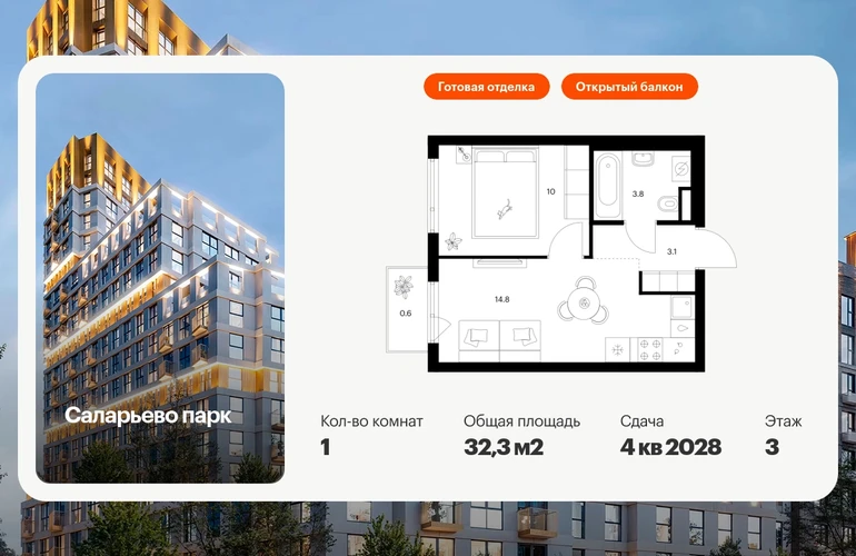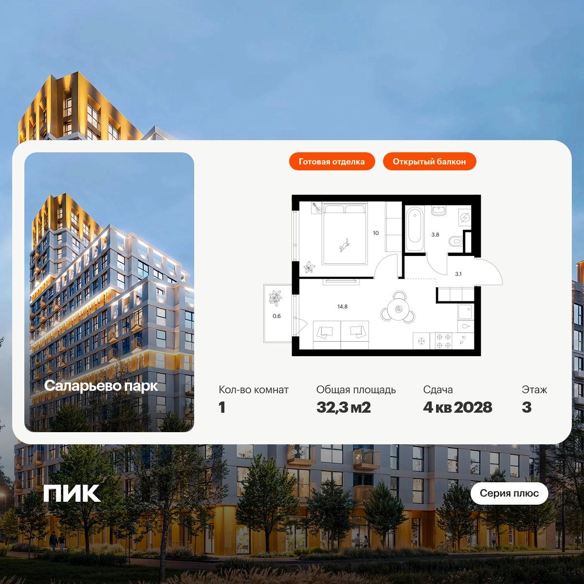 Продаётся 1-комн.квартира площадью 32.30 кв.м на 3 этаже 14 этажного дома (Корпус 82.6, секция 6) проекта ПИК Саларьево парк. Светлый просторный подъезд на уровне земли, функциональная планировка, большие окна, с отделкой. Артикул - 1032834О застройщике