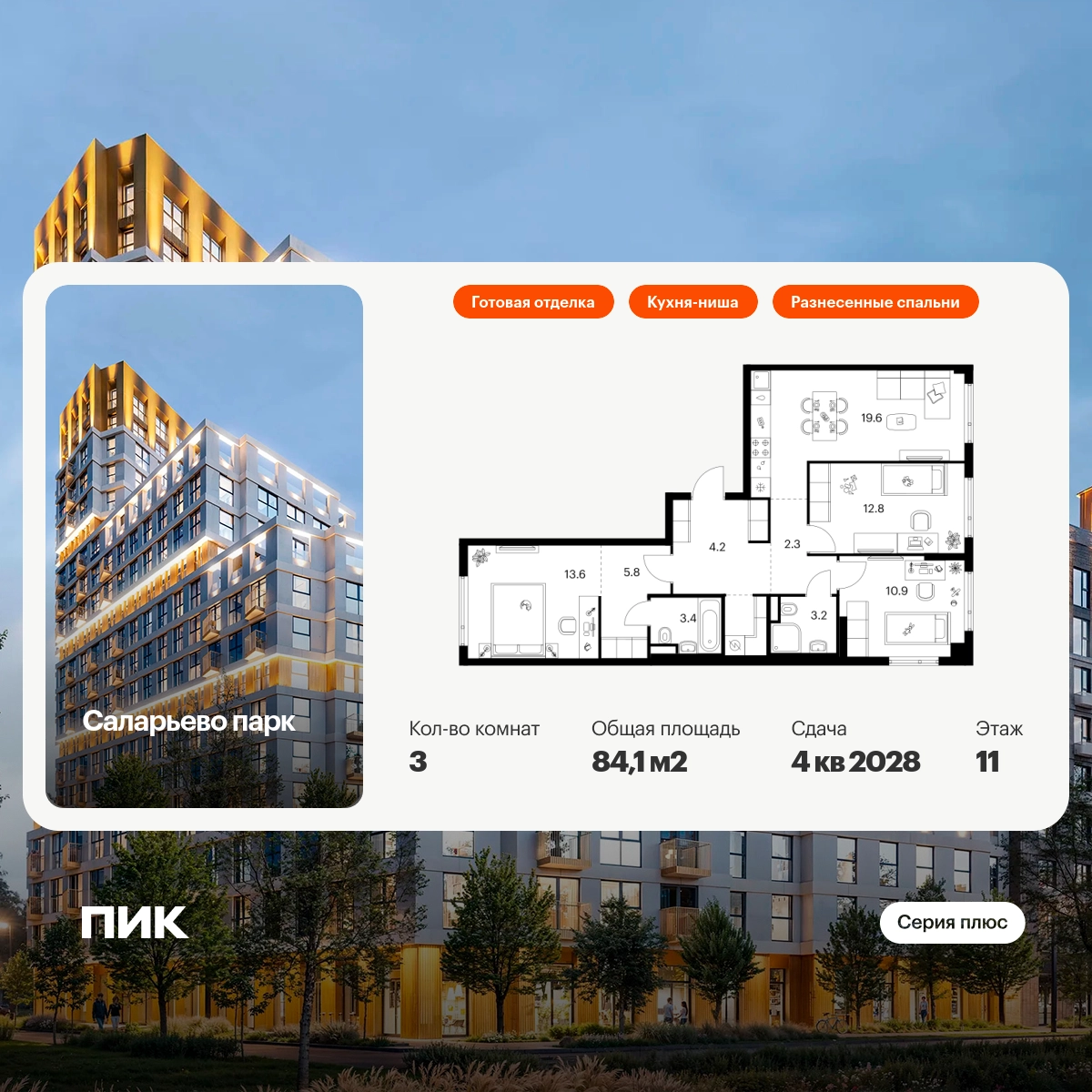 Продаётся 3-комн.квартира площадью 84.10 кв.м на 11 этаже 14 этажного дома (Корпус 82.6, секция 6) проекта ПИК Саларьево парк. Светлый просторный подъезд на уровне земли, функциональная планировка, большие окна, с отделкой. Жилой район «Саларьево парк» расположен в Новой Москве, в четырёх километрах от МКАД по Киевскому шоссе. Две станции метро: «Саларьево» и «Филатов луг», — находятся в пешей доступности от проекта. Дойти до них можно за 5–10 минут. В квартале уже создана качественная среда, где есть абсолютно всё для полноценной жизни, работы и отдыха. «Саларьево парк» — не просто квартал, а полноценный жилой район, который отличается разноплановой архитектурой. Над концепцией квартала работали несколько ведущих архитектурных бюро, которые стремились добиться разнообразия в фасадных решениях. Ярким примером такого подхода станут корпуса 82 и 83, которые относятся к «Серии плюс». Новый корпус 83 был создан по принципам южной архитектуры: расслабленный и лаконичный силуэт зданий, привлекающий к себе внимание. Архитектурная изюминка 83-го корпуса — террасы и фигурные балконы. Вместе с окнами и другими акцентными элементами они создают уникальный облик здания, отсылая нас к изысканной южной архитектуре. Все корпуса в квартале гармонично сочетаются, образуя единую городскую среду. Здесь приятно гулять и проводить время на улице всей семьёй. В «Саларьево парке» создана уникальная образовательная среда, включающая в себя шесть школ, рассчитанных на 6 250 учеников. Четыре из них уже открыты, их посещает 2 300 детей. Также на территории «Саларьево парка» находится 12 детских садов, один из которых с бассейном. Сейчас уже открыты 8 садов. В «Саларьево парке» открыта уникальная игровая площадка — PlayHub «Оригами». Здесь есть ручей, горка-труба и рельефные холмы. Взрослые смогут отдохнуть в уютном кафе, пока дети играют. Также на территории проекта есть SportHub — большая спортивная зона, разделённая по интересам и возрастам. Здесь можно заниматься разными видами спорта: футболом, баскетболом, волейболом и стритболом. Зимой центральную часть площадки превращают в каток. Во дворах-парках жилого квартала есть места для отдыха, детские и спортивные площадки. На первых этажах домов расположены магазины, кафе и полезные сервисы. Также вблизи проекта есть несколько масштабных торговых центров. До ТЦ «Саларис» пять минут пешком, до «Рио», Metro Cash & Carry и «Леруа Мерлен» — пять минут на автомобиле. Артикул - 1032886О застройщике
