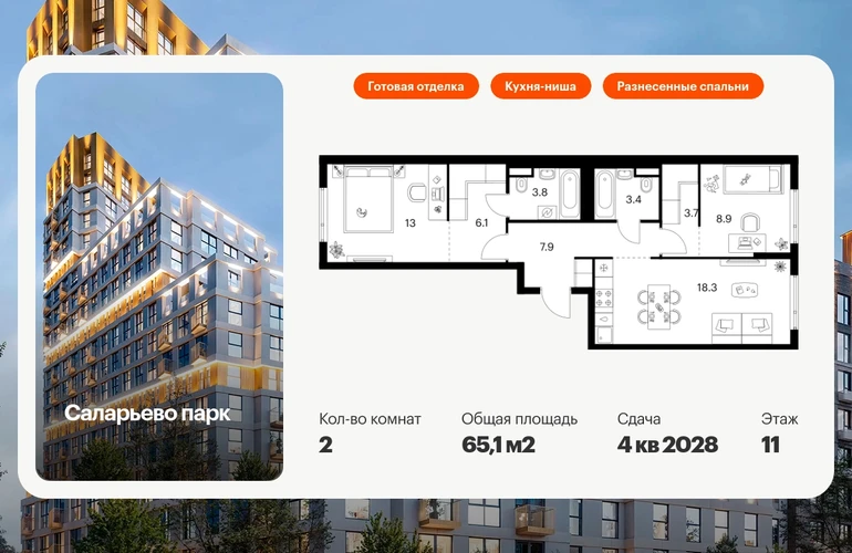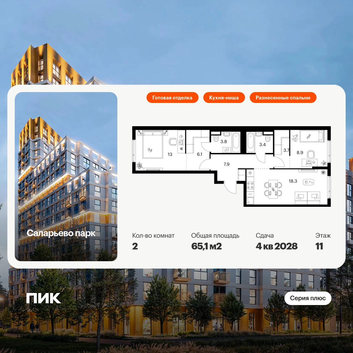Продаётся 2-комн.квартира площадью 65.10 кв.м на 11 этаже 14 этажного дома (Корпус 82.6, секция 6) проекта ПИК Саларьево парк. Светлый просторный подъезд на уровне земли, функциональная планировка, большие окна, с отделкой. Жилой район «Саларьево парк» расположен в Новой Москве, в четырёх километрах от МКАД по Киевскому шоссе. Две станции метро: «Саларьево» и «Филатов луг», — находятся в пешей доступности от проекта. Дойти до них можно за 5–10 минут. В квартале уже создана качественная среда, где есть абсолютно всё для полноценной жизни, работы и отдыха. «Саларьево парк» — не просто квартал, а полноценный жилой район, который отличается разноплановой архитектурой. Над концепцией квартала работали несколько ведущих архитектурных бюро, которые стремились добиться разнообразия в фасадных решениях. Ярким примером такого подхода станут корпуса 82 и 83, которые относятся к «Серии плюс». Новый корпус 83 был создан по принципам южной архитектуры: расслабленный и лаконичный силуэт зданий, привлекающий к себе внимание. Архитектурная изюминка 83-го корпуса — террасы и фигурные балконы. Вместе с окнами и другими акцентными элементами они создают уникальный облик здания, отсылая нас к изысканной южной архитектуре. Все корпуса в квартале гармонично сочетаются, образуя единую городскую среду. Здесь приятно гулять и проводить время на улице всей семьёй. В «Саларьево парке» создана уникальная образовательная среда, включающая в себя шесть школ, рассчитанных на 6 250 учеников. Четыре из них уже открыты, их посещает 2 300 детей. Также на территории «Саларьево парка» находится 12 детских садов, один из которых с бассейном. Сейчас уже открыты 8 садов. В «Саларьево парке» открыта уникальная игровая площадка — PlayHub «Оригами». Здесь есть ручей, горка-труба и рельефные холмы. Взрослые смогут отдохнуть в уютном кафе, пока дети играют. Также на территории проекта есть SportHub — большая спортивная зона, разделённая по интересам и возрастам. Здесь можно заниматься разными видами спорта: футболом, баскетболом, волейболом и стритболом. Зимой центральную часть площадки превращают в каток. Во дворах-парках жилого квартала есть места для отдыха, детские и спортивные площадки. На первых этажах домов расположены магазины, кафе и полезные сервисы. Также вблизи проекта есть несколько масштабных торговых центров. До ТЦ «Саларис» пять минут пешком, до «Рио», Metro Cash & Carry и «Леруа Мерлен» — пять минут на автомобиле. Артикул - 1032889О застройщике