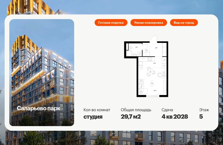 Продаётся квартира-студия площадью 29.70 кв.м на 5 этаже 16 этажного дома (Корпус 82.2, секция 2) проекта ПИК Саларьево парк. Светлый просторный подъезд на уровне земли, функциональная планировка, большие окна, с отделкой. Жилой район «Саларьево парк» расположен в Новой Москве, в четырёх километрах от МКАД по Киевскому шоссе. Две станции метро: «Саларьево» и «Филатов луг», — находятся в пешей доступности от проекта. Дойти до них можно за 5–10 минут. В квартале уже создана качественная среда, где есть абсолютно всё для полноценной жизни, работы и отдыха. «Саларьево парк» — не просто квартал, а полноценный жилой район, который отличается разноплановой архитектурой. Над концепцией квартала работали несколько ведущих архитектурных бюро, которые стремились добиться разнообразия в фасадных решениях. Ярким примером такого подхода станут корпуса 82 и 83, которые относятся к «Серии плюс». Новый корпус 83 был создан по принципам южной архитектуры: расслабленный и лаконичный силуэт зданий, привлекающий к себе внимание. Архитектурная изюминка 83-го корпуса — террасы и фигурные балконы. Вместе с окнами и другими акцентными элементами они создают уникальный облик здания, отсылая нас к изысканной южной архитектуре. Все корпуса в квартале гармонично сочетаются, образуя единую городскую среду. Здесь приятно гулять и проводить время на улице всей семьёй. В «Саларьево парке» создана уникальная образовательная среда, включающая в себя шесть школ, рассчитанных на 6 250 учеников. Четыре из них уже открыты, их посещает 2 300 детей. Также на территории «Саларьево парка» находится 12 детских садов, один из которых с бассейном. Сейчас уже открыты 8 садов. В «Саларьево парке» открыта уникальная игровая площадка — PlayHub «Оригами». Здесь есть ручей, горка-труба и рельефные холмы. Взрослые смогут отдохнуть в уютном кафе, пока дети играют. Также на территории проекта есть SportHub — большая спортивная зона, разделённая по интересам и возрастам. Здесь можно заниматься разными видами спорта: футболом, баскетболом, волейболом и стритболом. Зимой центральную часть площадки превращают в каток. Во дворах-парках жилого квартала есть места для отдыха, детские и спортивные площадки. На первых этажах домов расположены магазины, кафе и полезные сервисы. Также вблизи проекта есть несколько масштабных торговых центров. До ТЦ «Саларис» пять минут пешком, до «Рио», Metro Cash & Carry и «Леруа Мерлен» — пять минут на автомобиле. Артикул - 1032312О застройщике