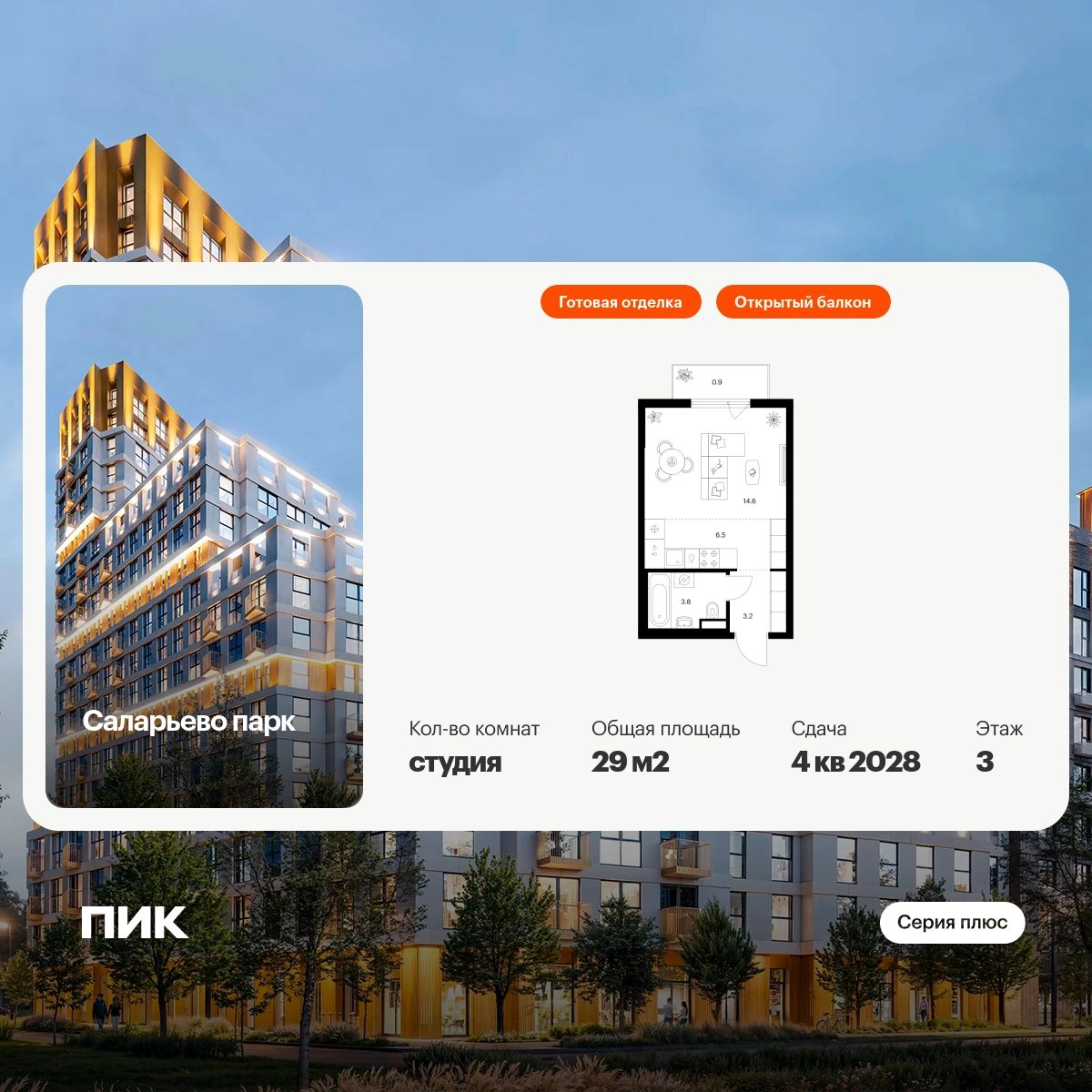 Продаётся квартира-студия площадью 29.00 кв.м на 3 этаже 16 этажного дома (Корпус 82.2, секция 2) проекта ПИК Саларьево парк. Светлый просторный подъезд на уровне земли, функциональная планировка, большие окна, с отделкой. Жилой район «Саларьево парк» расположен в Новой Москве, в четырёх километрах от МКАД по Киевскому шоссе. Две станции метро: «Саларьево» и «Филатов луг», — находятся в пешей доступности от проекта. Дойти до них можно за 5–10 минут. В квартале уже создана качественная среда, где есть абсолютно всё для полноценной жизни, работы и отдыха. «Саларьево парк» — не просто квартал, а полноценный жилой район, который отличается разноплановой архитектурой. Над концепцией квартала работали несколько ведущих архитектурных бюро, которые стремились добиться разнообразия в фасадных решениях. Ярким примером такого подхода станут корпуса 82 и 83, которые относятся к «Серии плюс». Новый корпус 83 был создан по принципам южной архитектуры: расслабленный и лаконичный силуэт зданий, привлекающий к себе внимание. Архитектурная изюминка 83-го корпуса — террасы и фигурные балконы. Вместе с окнами и другими акцентными элементами они создают уникальный облик здания, отсылая нас к изысканной южной архитектуре. Все корпуса в квартале гармонично сочетаются, образуя единую городскую среду. Здесь приятно гулять и проводить время на улице всей семьёй. В «Саларьево парке» создана уникальная образовательная среда, включающая в себя шесть школ, рассчитанных на 6 250 учеников. Четыре из них уже открыты, их посещает 2 300 детей. Также на территории «Саларьево парка» находится 12 детских садов, один из которых с бассейном. Сейчас уже открыты 8 садов. В «Саларьево парке» открыта уникальная игровая площадка — PlayHub «Оригами». Здесь есть ручей, горка-труба и рельефные холмы. Взрослые смогут отдохнуть в уютном кафе, пока дети играют. Также на территории проекта есть SportHub — большая спортивная зона, разделённая по интересам и возрастам. Здесь можно заниматься разными видами спорта: футболом, баскетболом, волейболом и стритболом. Зимой центральную часть площадки превращают в каток. Во дворах-парках жилого квартала есть места для отдыха, детские и спортивные площадки. На первых этажах домов расположены магазины, кафе и полезные сервисы. Также вблизи проекта есть несколько масштабных торговых центров. До ТЦ «Саларис» пять минут пешком, до «Рио», Metro Cash & Carry и «Леруа Мерлен» — пять минут на автомобиле. Артикул - 1032262О застройщике