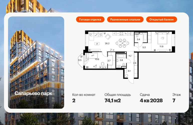 Продаётся 2-комн.квартира площадью 74.10 кв.м на 7 этаже 16 этажного дома (Корпус 82.2, секция 2) проекта ПИК Саларьево парк. Светлый просторный подъезд на уровне земли, функциональная планировка, большие окна, с отделкой. Жилой район «Саларьево парк» расположен в Новой Москве, в четырёх километрах от МКАД по Киевскому шоссе. Две станции метро: «Саларьево» и «Филатов луг», — находятся в пешей доступности от проекта. Дойти до них можно за 5–10 минут. В квартале уже создана качественная среда, где есть абсолютно всё для полноценной жизни, работы и отдыха. «Саларьево парк» — не просто квартал, а полноценный жилой район, который отличается разноплановой архитектурой. Над концепцией квартала работали несколько ведущих архитектурных бюро, которые стремились добиться разнообразия в фасадных решениях. Ярким примером такого подхода станут корпуса 82 и 83, которые относятся к «Серии плюс». Новый корпус 83 был создан по принципам южной архитектуры: расслабленный и лаконичный силуэт зданий, привлекающий к себе внимание. Архитектурная изюминка 83-го корпуса — террасы и фигурные балконы. Вместе с окнами и другими акцентными элементами они создают уникальный облик здания, отсылая нас к изысканной южной архитектуре. Все корпуса в квартале гармонично сочетаются, образуя единую городскую среду. Здесь приятно гулять и проводить время на улице всей семьёй. В «Саларьево парке» создана уникальная образовательная среда, включающая в себя шесть школ, рассчитанных на 6 250 учеников. Четыре из них уже открыты, их посещает 2 300 детей. Также на территории «Саларьево парка» находится 12 детских садов, один из которых с бассейном. Сейчас уже открыты 8 садов. В «Саларьево парке» открыта уникальная игровая площадка — PlayHub «Оригами». Здесь есть ручей, горка-труба и рельефные холмы. Взрослые смогут отдохнуть в уютном кафе, пока дети играют. Также на территории проекта есть SportHub — большая спортивная зона, разделённая по интересам и возрастам. Здесь можно заниматься разными видами спорта: футболом, баскетболом, волейболом и стритболом. Зимой центральную часть площадки превращают в каток. Во дворах-парках жилого квартала есть места для отдыха, детские и спортивные площадки. На первых этажах домов расположены магазины, кафе и полезные сервисы. Также вблизи проекта есть несколько масштабных торговых центров. До ТЦ «Саларис» пять минут пешком, до «Рио», Metro Cash & Carry и «Леруа Мерлен» — пять минут на автомобиле. Артикул - 1032360О застройщике
