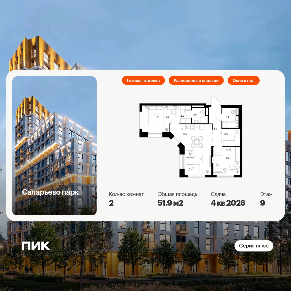 Продаётся 2-комн.квартира площадью 51.90 кв.м на 9 этаже 16 этажного дома (Корпус 82.2, секция 2) проекта ПИК Саларьево парк. Светлый просторный подъезд на уровне земли, функциональная планировка, большие окна, с отделкой. Жилой район «Саларьево парк» расположен в Новой Москве, в четырёх километрах от МКАД по Киевскому шоссе. Две станции метро: «Саларьево» и «Филатов луг», — находятся в пешей доступности от проекта. Дойти до них можно за 5–10 минут. В квартале уже создана качественная среда, где есть абсолютно всё для полноценной жизни, работы и отдыха. «Саларьево парк» — не просто квартал, а полноценный жилой район, который отличается разноплановой архитектурой. Над концепцией квартала работали несколько ведущих архитектурных бюро, которые стремились добиться разнообразия в фасадных решениях. Ярким примером такого подхода станут корпуса 82 и 83, которые относятся к «Серии плюс». Новый корпус 83 был создан по принципам южной архитектуры: расслабленный и лаконичный силуэт зданий, привлекающий к себе внимание. Архитектурная изюминка 83-го корпуса — террасы и фигурные балконы. Вместе с окнами и другими акцентными элементами они создают уникальный облик здания, отсылая нас к изысканной южной архитектуре. Все корпуса в квартале гармонично сочетаются, образуя единую городскую среду. Здесь приятно гулять и проводить время на улице всей семьёй. В «Саларьево парке» создана уникальная образовательная среда, включающая в себя шесть школ, рассчитанных на 6 250 учеников. Четыре из них уже открыты, их посещает 2 300 детей. Также на территории «Саларьево парка» находится 12 детских садов, один из которых с бассейном. Сейчас уже открыты 8 садов. В «Саларьево парке» открыта уникальная игровая площадка — PlayHub «Оригами». Здесь есть ручей, горка-труба и рельефные холмы. Взрослые смогут отдохнуть в уютном кафе, пока дети играют. Также на территории проекта есть SportHub — большая спортивная зона, разделённая по интересам и возрастам. Здесь можно заниматься разными видами спорта: футболом, баскетболом, волейболом и стритболом. Зимой центральную часть площадки превращают в каток. Во дворах-парках жилого квартала есть места для отдыха, детские и спортивные площадки. На первых этажах домов расположены магазины, кафе и полезные сервисы. Также вблизи проекта есть несколько масштабных торговых центров. До ТЦ «Саларис» пять минут пешком, до «Рио», Metro Cash & Carry и «Леруа Мерлен» — пять минут на автомобиле. Артикул - 1032366О застройщике