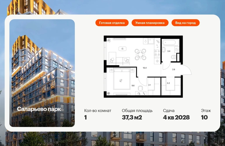 Продаётся 1-комн.квартира площадью 37.30 кв.м на 10 этаже 16 этажного дома (Корпус 82.2, секция 2) проекта ПИК Саларьево парк. Светлый просторный подъезд на уровне земли, функциональная планировка, большие окна, с отделкой. Жилой район «Саларьево парк» расположен в Новой Москве, в четырёх километрах от МКАД по Киевскому шоссе. Две станции метро: «Саларьево» и «Филатов луг», — находятся в пешей доступности от проекта. Дойти до них можно за 5–10 минут. В квартале уже создана качественная среда, где есть абсолютно всё для полноценной жизни, работы и отдыха. «Саларьево парк» — не просто квартал, а полноценный жилой район, который отличается разноплановой архитектурой. Над концепцией квартала работали несколько ведущих архитектурных бюро, которые стремились добиться разнообразия в фасадных решениях. Ярким примером такого подхода станут корпуса 82 и 83, которые относятся к «Серии плюс». Новый корпус 83 был создан по принципам южной архитектуры: расслабленный и лаконичный силуэт зданий, привлекающий к себе внимание. Архитектурная изюминка 83-го корпуса — террасы и фигурные балконы. Вместе с окнами и другими акцентными элементами они создают уникальный облик здания, отсылая нас к изысканной южной архитектуре. Все корпуса в квартале гармонично сочетаются, образуя единую городскую среду. Здесь приятно гулять и проводить время на улице всей семьёй. В «Саларьево парке» создана уникальная образовательная среда, включающая в себя шесть школ, рассчитанных на 6 250 учеников. Четыре из них уже открыты, их посещает 2 300 детей. Также на территории «Саларьево парка» находится 12 детских садов, один из которых с бассейном. Сейчас уже открыты 8 садов. В «Саларьево парке» открыта уникальная игровая площадка — PlayHub «Оригами». Здесь есть ручей, горка-труба и рельефные холмы. Взрослые смогут отдохнуть в уютном кафе, пока дети играют. Также на территории проекта есть SportHub — большая спортивная зона, разделённая по интересам и возрастам. Здесь можно заниматься разными видами спорта: футболом, баскетболом, волейболом и стритболом. Зимой центральную часть площадки превращают в каток. Во дворах-парках жилого квартала есть места для отдыха, детские и спортивные площадки. На первых этажах домов расположены магазины, кафе и полезные сервисы. Также вблизи проекта есть несколько масштабных торговых центров. До ТЦ «Саларис» пять минут пешком, до «Рио», Metro Cash & Carry и «Леруа Мерлен» — пять минут на автомобиле. Артикул - 1032369О застройщике