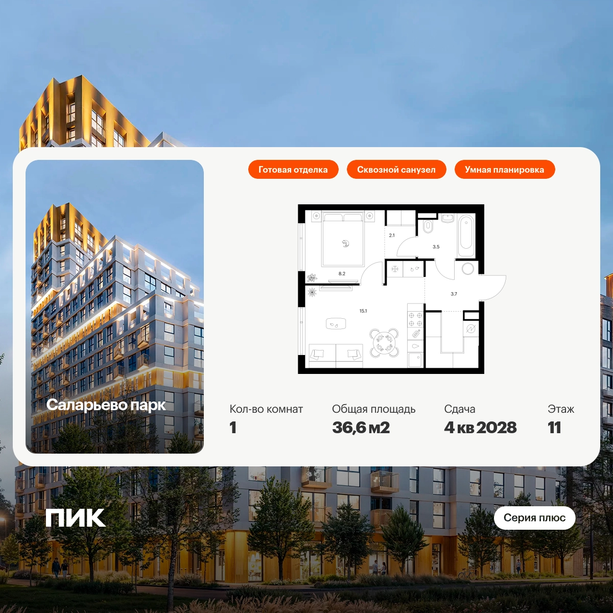 Продаётся 1-комн.квартира площадью 36.60 кв.м на 11 этаже 16 этажного дома (Корпус 82.2, секция 2) проекта ПИК Саларьево парк. Светлый просторный подъезд на уровне земли, функциональная планировка, большие окна, с отделкой. Жилой район «Саларьево парк» расположен в Новой Москве, в четырёх километрах от МКАД по Киевскому шоссе. Две станции метро: «Саларьево» и «Филатов луг», — находятся в пешей доступности от проекта. Дойти до них можно за 5–10 минут. В квартале уже создана качественная среда, где есть абсолютно всё для полноценной жизни, работы и отдыха. «Саларьево парк» — не просто квартал, а полноценный жилой район, который отличается разноплановой архитектурой. Над концепцией квартала работали несколько ведущих архитектурных бюро, которые стремились добиться разнообразия в фасадных решениях. Ярким примером такого подхода станут корпуса 82 и 83, которые относятся к «Серии плюс». Новый корпус 83 был создан по принципам южной архитектуры: расслабленный и лаконичный силуэт зданий, привлекающий к себе внимание. Архитектурная изюминка 83-го корпуса — террасы и фигурные балконы. Вместе с окнами и другими акцентными элементами они создают уникальный облик здания, отсылая нас к изысканной южной архитектуре. Все корпуса в квартале гармонично сочетаются, образуя единую городскую среду. Здесь приятно гулять и проводить время на улице всей семьёй. В «Саларьево парке» создана уникальная образовательная среда, включающая в себя шесть школ, рассчитанных на 6 250 учеников. Четыре из них уже открыты, их посещает 2 300 детей. Также на территории «Саларьево парка» находится 12 детских садов, один из которых с бассейном. Сейчас уже открыты 8 садов. В «Саларьево парке» открыта уникальная игровая площадка — PlayHub «Оригами». Здесь есть ручей, горка-труба и рельефные холмы. Взрослые смогут отдохнуть в уютном кафе, пока дети играют. Также на территории проекта есть SportHub — большая спортивная зона, разделённая по интересам и возрастам. Здесь можно заниматься разными видами спорта: футболом, баскетболом, волейболом и стритболом. Зимой центральную часть площадки превращают в каток. Во дворах-парках жилого квартала есть места для отдыха, детские и спортивные площадки. На первых этажах домов расположены магазины, кафе и полезные сервисы. Также вблизи проекта есть несколько масштабных торговых центров. До ТЦ «Саларис» пять минут пешком, до «Рио», Metro Cash & Carry и «Леруа Мерлен» — пять минут на автомобиле. Артикул - 1032393О застройщике