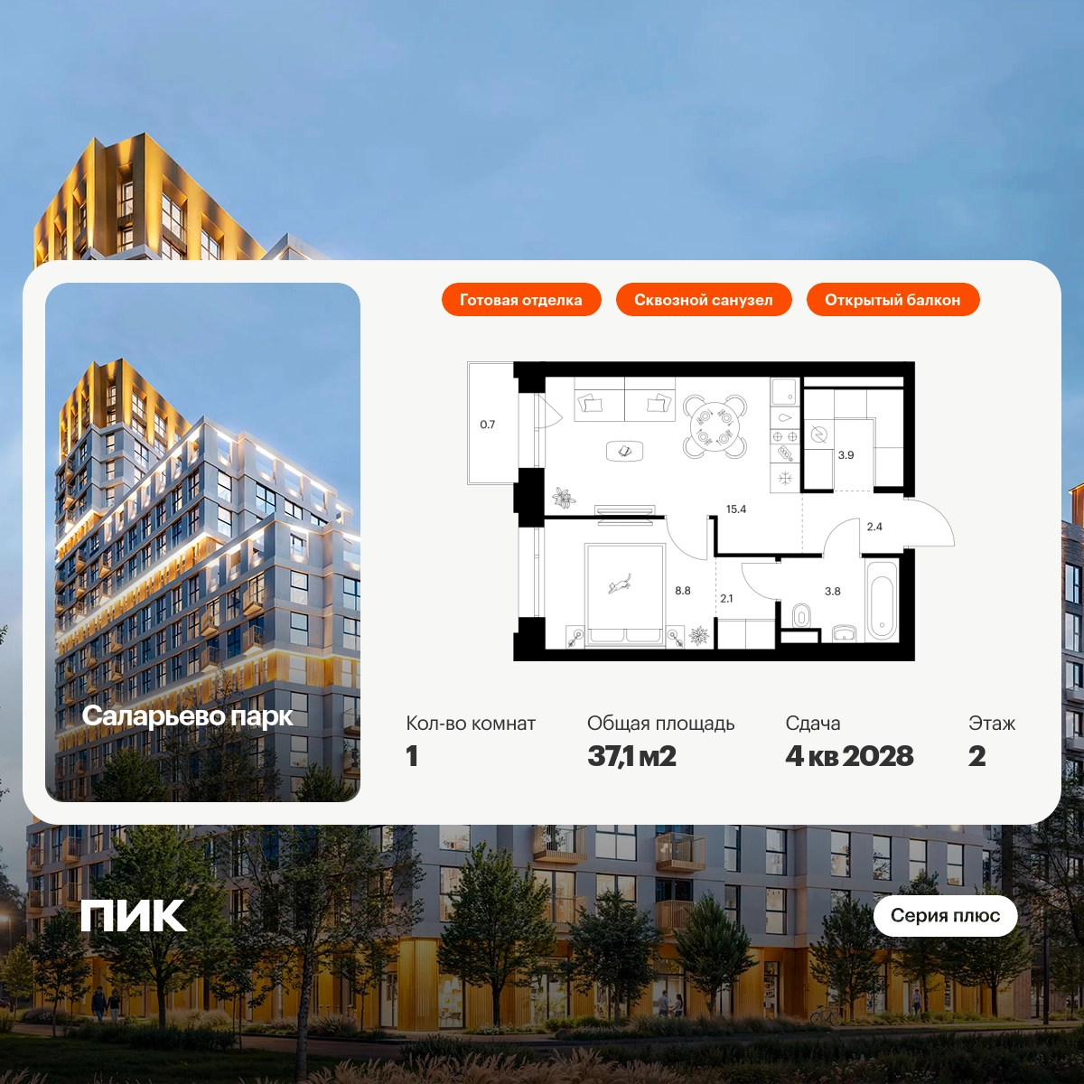 Продаётся 1-комн.квартира площадью 37.10 кв.м на 2 этаже 24 этажного дома (Корпус 82.8, секция 8) проекта ПИК Саларьево парк. Светлый просторный подъезд на уровне земли, функциональная планировка, большие окна, с отделкой. Жилой район «Саларьево парк» расположен в Новой Москве, в четырёх километрах от МКАД по Киевскому шоссе. Две станции метро: «Саларьево» и «Филатов луг», — находятся в пешей доступности от проекта. Дойти до них можно за 5–10 минут. В квартале уже создана качественная среда, где есть абсолютно всё для полноценной жизни, работы и отдыха. «Саларьево парк» — не просто квартал, а полноценный жилой район, который отличается разноплановой архитектурой. Над концепцией квартала работали несколько ведущих архитектурных бюро, которые стремились добиться разнообразия в фасадных решениях. Ярким примером такого подхода станут корпуса 82 и 83, которые относятся к «Серии плюс». Новый корпус 83 был создан по принципам южной архитектуры: расслабленный и лаконичный силуэт зданий, привлекающий к себе внимание. Архитектурная изюминка 83-го корпуса — террасы и фигурные балконы. Вместе с окнами и другими акцентными элементами они создают уникальный облик здания, отсылая нас к изысканной южной архитектуре. Все корпуса в квартале гармонично сочетаются, образуя единую городскую среду. Здесь приятно гулять и проводить время на улице всей семьёй. В «Саларьево парке» создана уникальная образовательная среда, включающая в себя шесть школ, рассчитанных на 6 250 учеников. Четыре из них уже открыты, их посещает 2 300 детей. Также на территории «Саларьево парка» находится 12 детских садов, один из которых с бассейном. Сейчас уже открыты 8 садов. В «Саларьево парке» открыта уникальная игровая площадка — PlayHub «Оригами». Здесь есть ручей, горка-труба и рельефные холмы. Взрослые смогут отдохнуть в уютном кафе, пока дети играют. Также на территории проекта есть SportHub — большая спортивная зона, разделённая по интересам и возрастам. Здесь можно заниматься разными видами спорта: футболом, баскетболом, волейболом и стритболом. Зимой центральную часть площадки превращают в каток. Во дворах-парках жилого квартала есть места для отдыха, детские и спортивные площадки. На первых этажах домов расположены магазины, кафе и полезные сервисы. Также вблизи проекта есть несколько масштабных торговых центров. До ТЦ «Саларис» пять минут пешком, до «Рио», Metro Cash & Carry и «Леруа Мерлен» — пять минут на автомобиле. Артикул - 1033121О застройщике