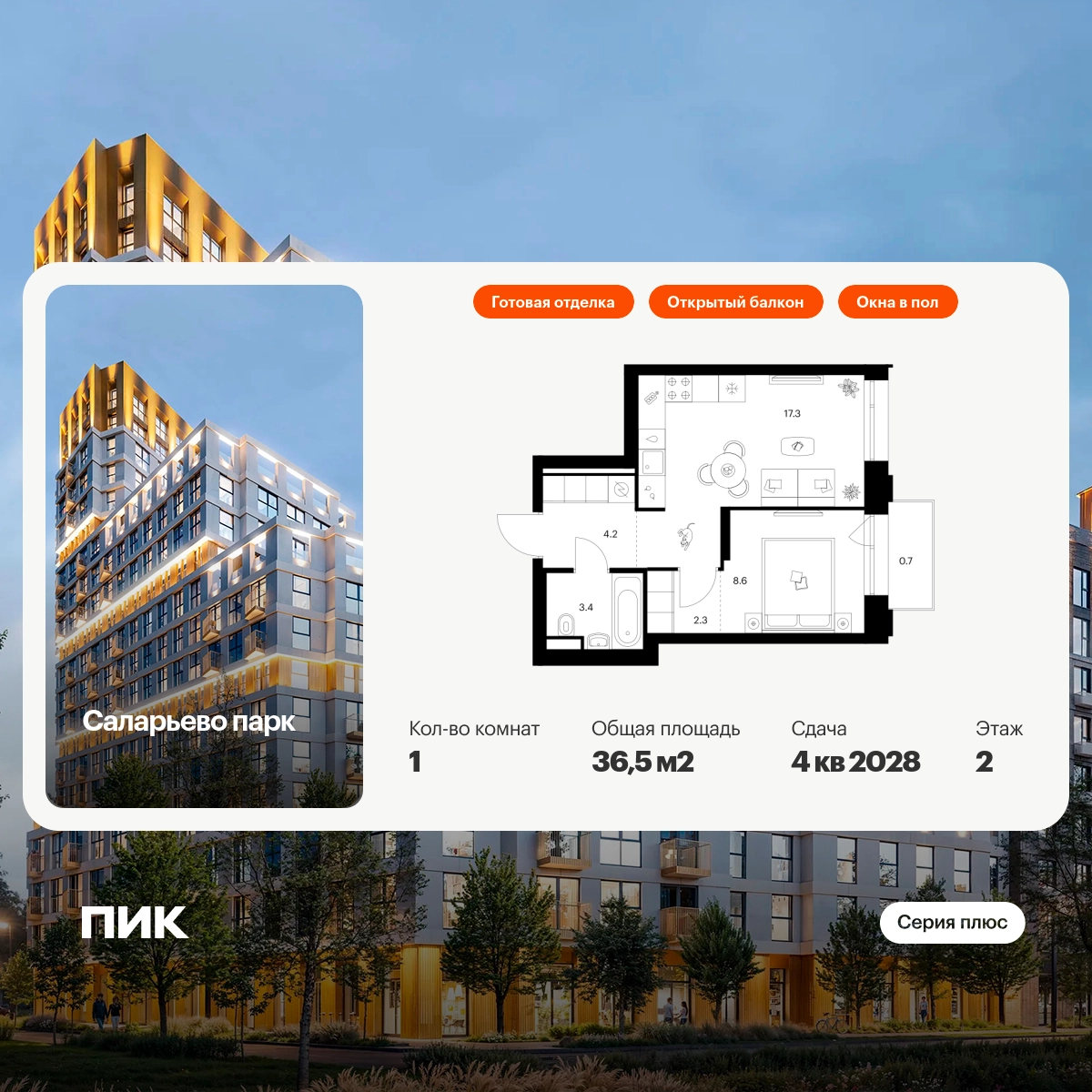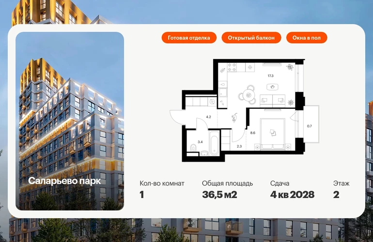 Продаётся 1-комн.квартира площадью 36.50 кв.м на 2 этаже 24 этажного дома (Корпус 82.8, секция 8) проекта ПИК Саларьево парк. Светлый просторный подъезд на уровне земли, функциональная планировка, большие окна, с отделкой. Жилой район «Саларьево парк» расположен в Новой Москве, в четырёх километрах от МКАД по Киевскому шоссе. Две станции метро: «Саларьево» и «Филатов луг», — находятся в пешей доступности от проекта. Дойти до них можно за 5–10 минут. В квартале уже создана качественная среда, где есть абсолютно всё для полноценной жизни, работы и отдыха. «Саларьево парк» — не просто квартал, а полноценный жилой район, который отличается разноплановой архитектурой. Над концепцией квартала работали несколько ведущих архитектурных бюро, которые стремились добиться разнообразия в фасадных решениях. Ярким примером такого подхода станут корпуса 82 и 83, которые относятся к «Серии плюс». Новый корпус 83 был создан по принципам южной архитектуры: расслабленный и лаконичный силуэт зданий, привлекающий к себе внимание. Архитектурная изюминка 83-го корпуса — террасы и фигурные балконы. Вместе с окнами и другими акцентными элементами они создают уникальный облик здания, отсылая нас к изысканной южной архитектуре. Все корпуса в квартале гармонично сочетаются, образуя единую городскую среду. Здесь приятно гулять и проводить время на улице всей семьёй. В «Саларьево парке» создана уникальная образовательная среда, включающая в себя шесть школ, рассчитанных на 6 250 учеников. Четыре из них уже открыты, их посещает 2 300 детей. Также на территории «Саларьево парка» находится 12 детских садов, один из которых с бассейном. Сейчас уже открыты 8 садов. В «Саларьево парке» открыта уникальная игровая площадка — PlayHub «Оригами». Здесь есть ручей, горка-труба и рельефные холмы. Взрослые смогут отдохнуть в уютном кафе, пока дети играют. Также на территории проекта есть SportHub — большая спортивная зона, разделённая по интересам и возрастам. Здесь можно заниматься разными видами спорта: футболом, баскетболом, волейболом и стритболом. Зимой центральную часть площадки превращают в каток. Во дворах-парках жилого квартала есть места для отдыха, детские и спортивные площадки. На первых этажах домов расположены магазины, кафе и полезные сервисы. Также вблизи проекта есть несколько масштабных торговых центров. До ТЦ «Саларис» пять минут пешком, до «Рио», Metro Cash & Carry и «Леруа Мерлен» — пять минут на автомобиле. Артикул - 1033135О застройщике